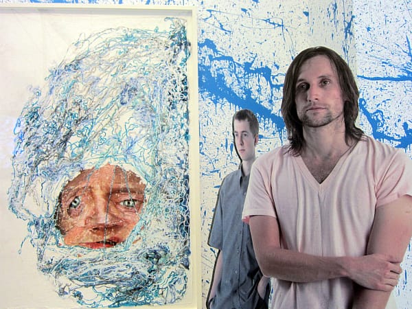 The two-dimensional figures were made from photographs of some of Kessler’s MFA students at Columbia University, where he is a professor, and they all are in the somewhat awkward poses of people who know they are being photographed and want to appear casual. It would be distracting, but since you are also trying to view the art while aware that you are being filmed by the twisting little cameras, the real and flat people make for a homogeneously self-conscious crowd. A few of the figures are smeared with blue paint below their eyes or over their mouths, which weakens the effect.