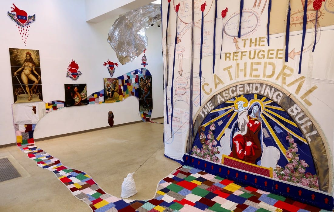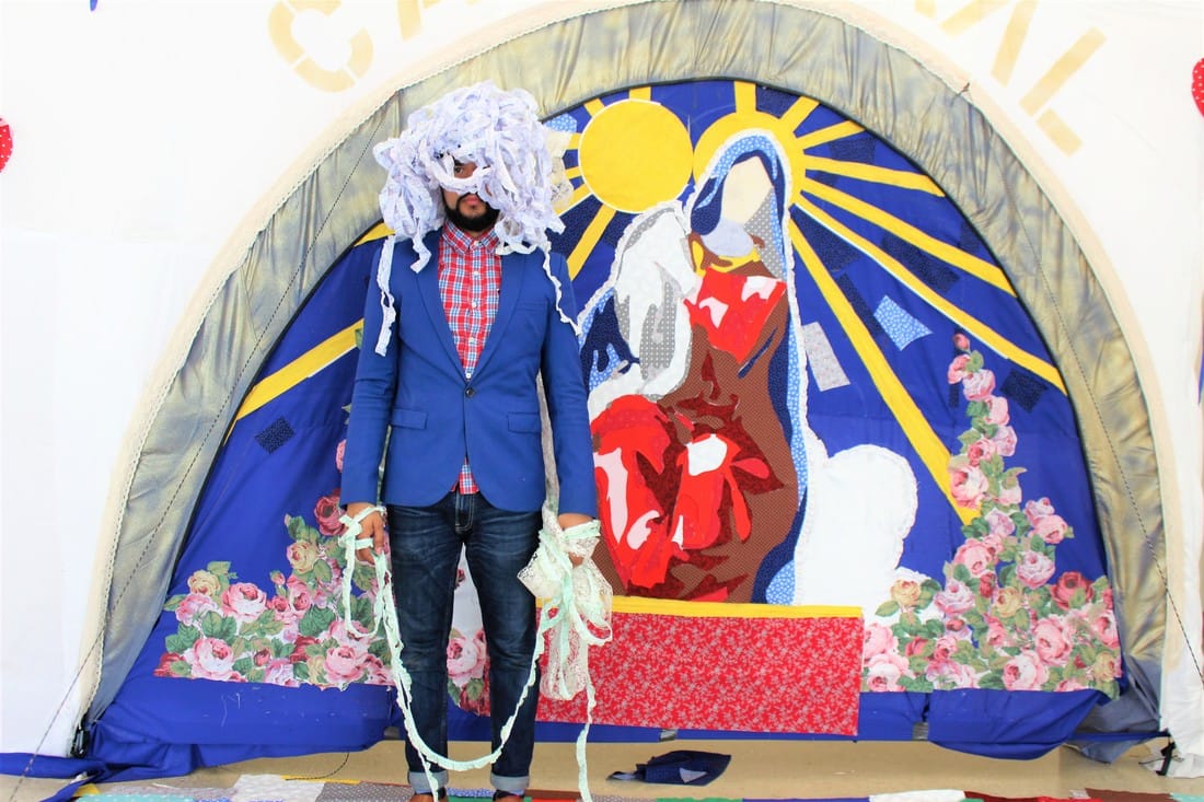Jônatas’s work dives deep into a tangled tale of migration and diaspora. In a play on “Dona,” an Iberian address for a distinguished woman, “5 Madonnas In Exile” (2018) was an installation dedicated to his family’s Sephardic matriarchs. In a parody of Catholic imagery, he sewed and sculpted a dazzling fabric “Refugee Cathedral” which included a silhouette of the archetypal Mother Mary, holding up a baby with tiny horns and cow’s ears. “This piece was a slap in the face to the Catholic church,” he said. “I had to do it at least once.”