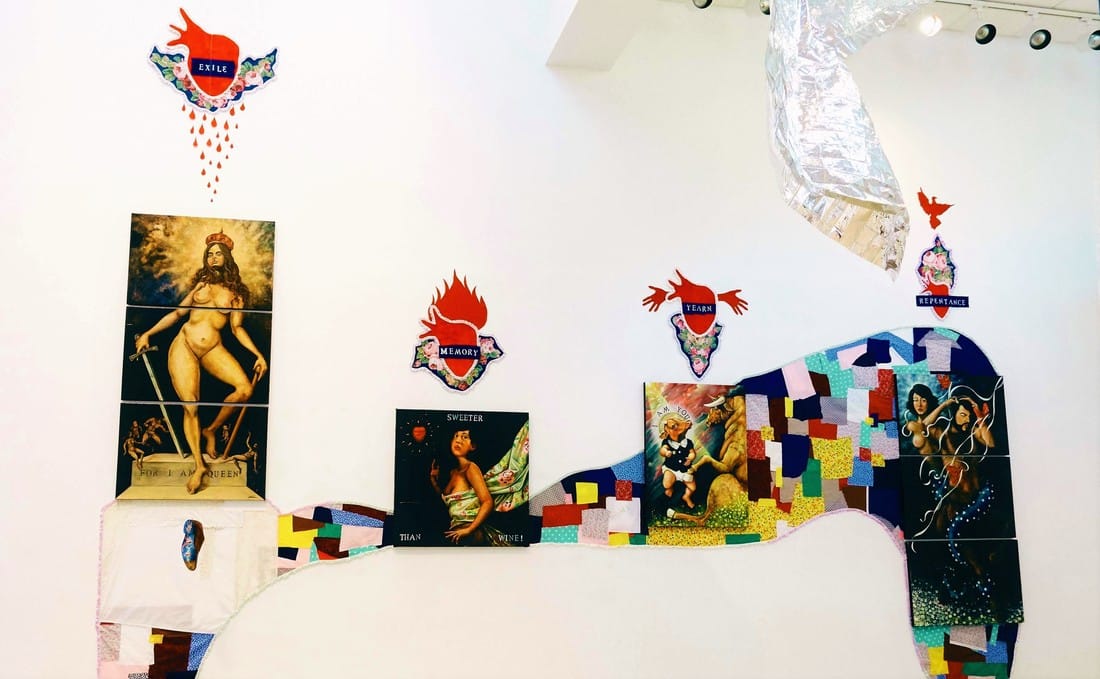 Although he is now a practicing Jew, Jônatas does not describe himself as a “Jewish artist.” His Brazilian background also plays heavily in his work, from which he draws, alongside his Sephardic family’s exile story, to address the global migration crisis. Although it deals with a serious subject matter, “5 Madonnas” features bright, joyful colors that swirl around defiant portraits of his female subjects. One of the “Madonnas” exudes power as she steps down from a stone block engraved with text that proclaims, “FOR I AM QUEEN.” Jônatas makes a comparison between the Inquisition-era treatment of Jews and the United States’s criminalization and simultaneous exploitation of Latine, Indigenous migrants. “I wanted to speak about sacrificing the strength of a country, which in the US, is the immigrant.”