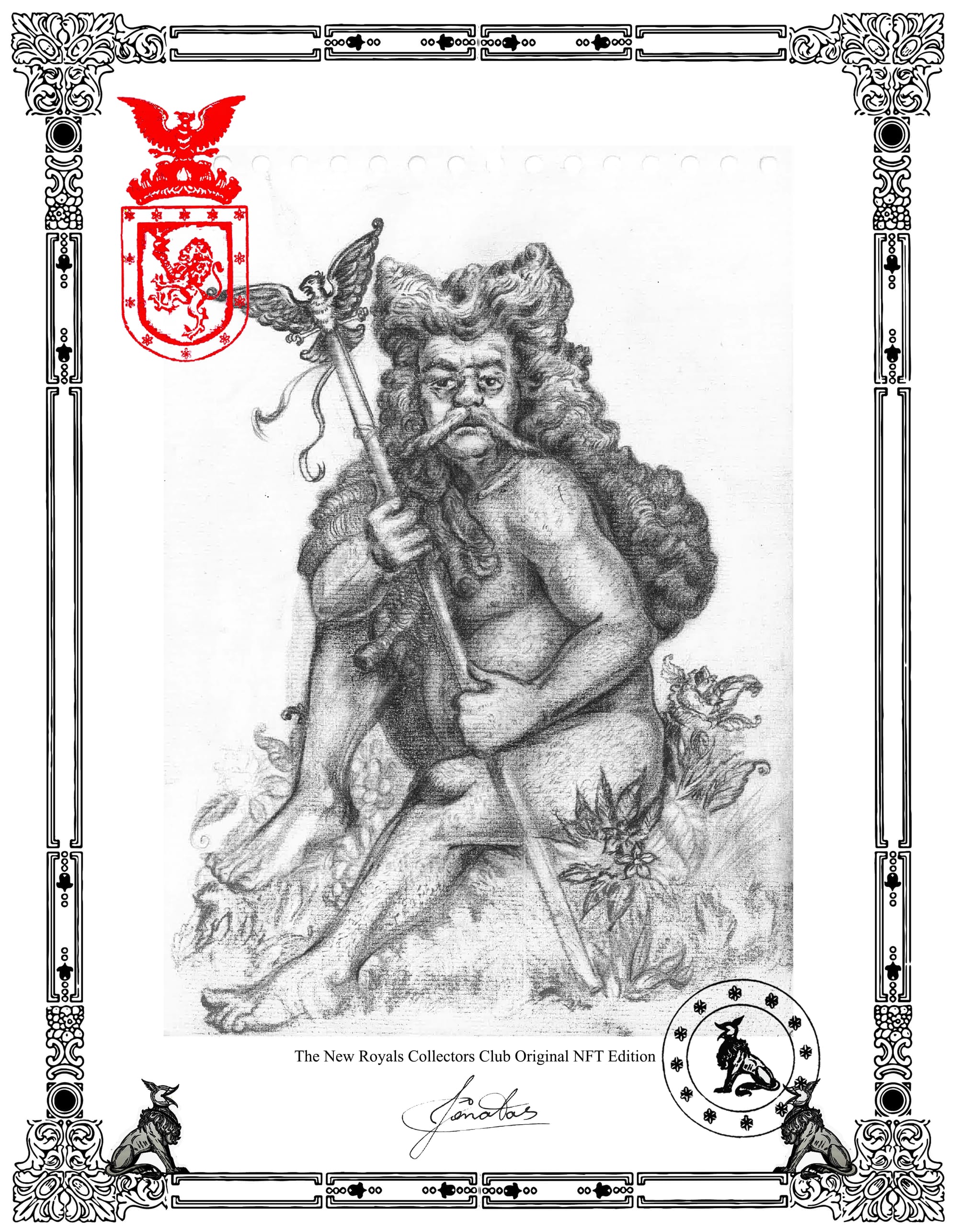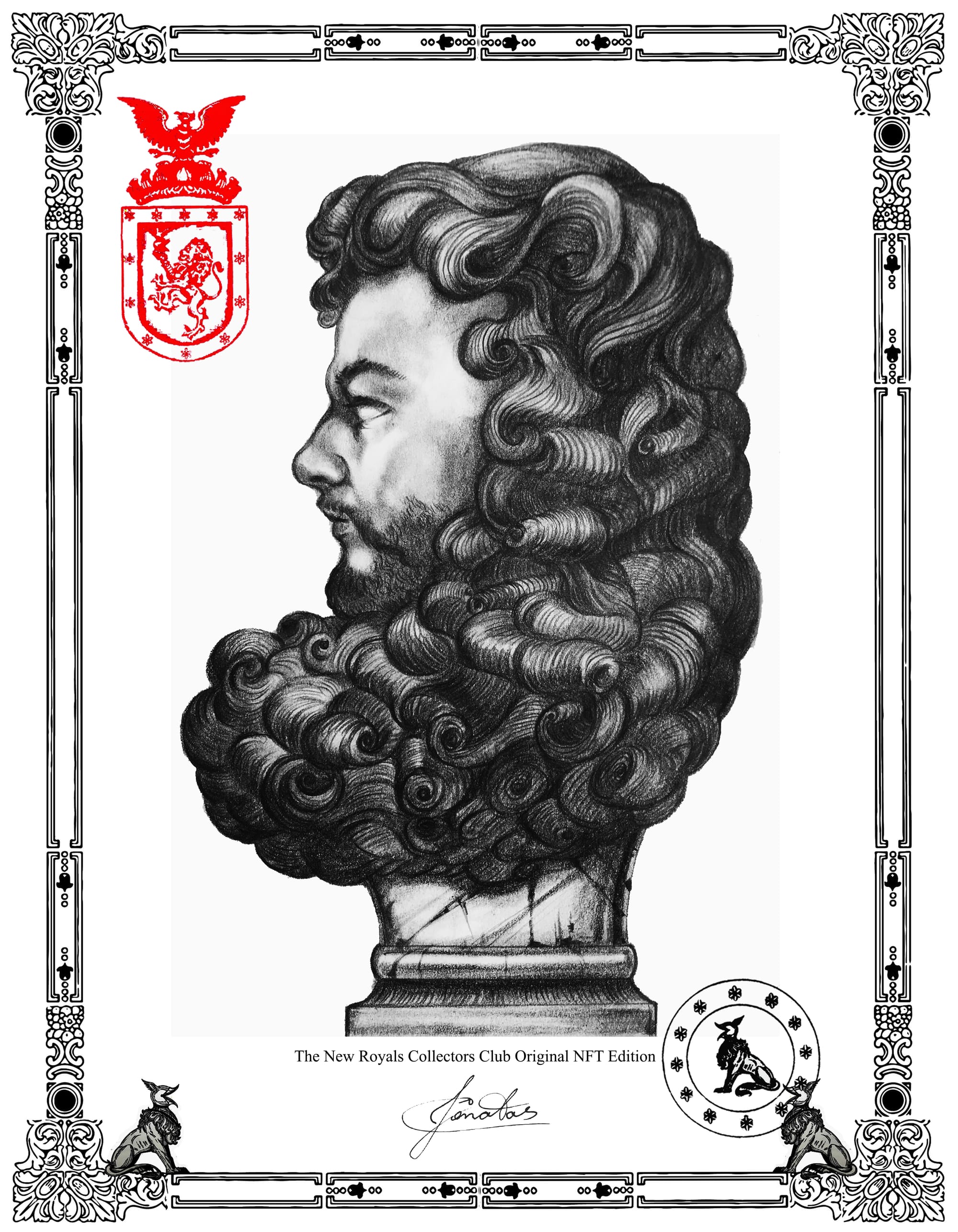 During his travels back and forth between Miami and Paris, Jônatas has begun drawing altered portraits of the stone royals crowning historic French palaces, combining them with his heraldry designs. Reminiscent of The Emperor's New Clothes, an otherwise stately official poses in his birthday suit in “Exilarch II: Composure Besides Nakedness in the Wilderness.”