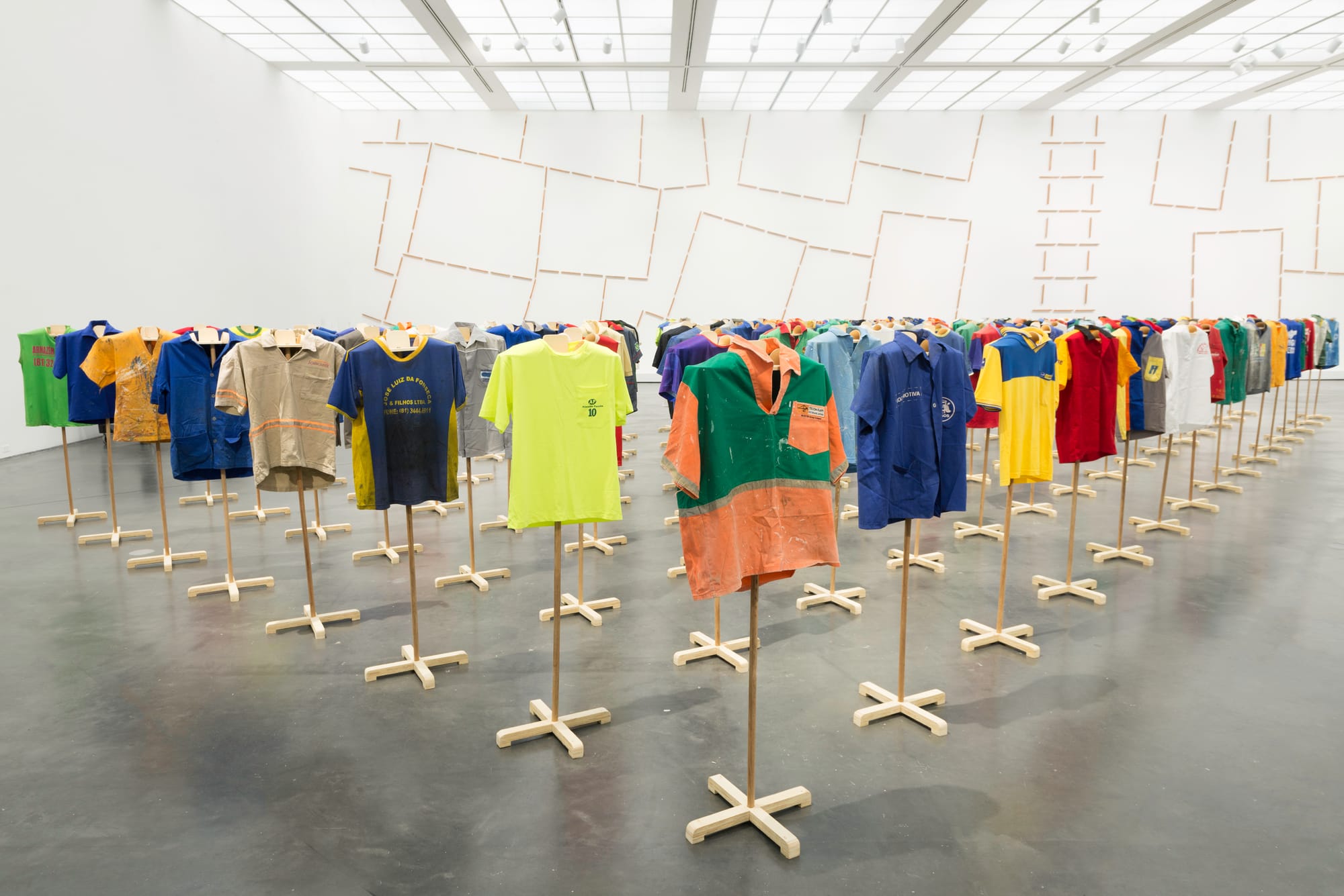 The title is particularly apt, as the exhibition addresses and troubles concept of commensurability. For example, a large-scale installation, “Suar a camisa” (Working up a sweat) (2014), consists of 120 dirty t-shirts from Brazilian laborers displayed on wooden supports, creating the sense of a crowd of workers. To produce this work, de Andrade approached laborers on the street and asked them to trade their dirty and stained shirts for his clean one. De Andrade thus takes on the life cycle of the workers, whose vitality is gradually sapped by years entrapped in a capitalist system, earning a living by the sweat of their brows. By bringing these traces of Latin American labor to the museum-going public, Suar a camisa confronts viewers with the international reality of exploitation and capital flows all too often invisible in the US.