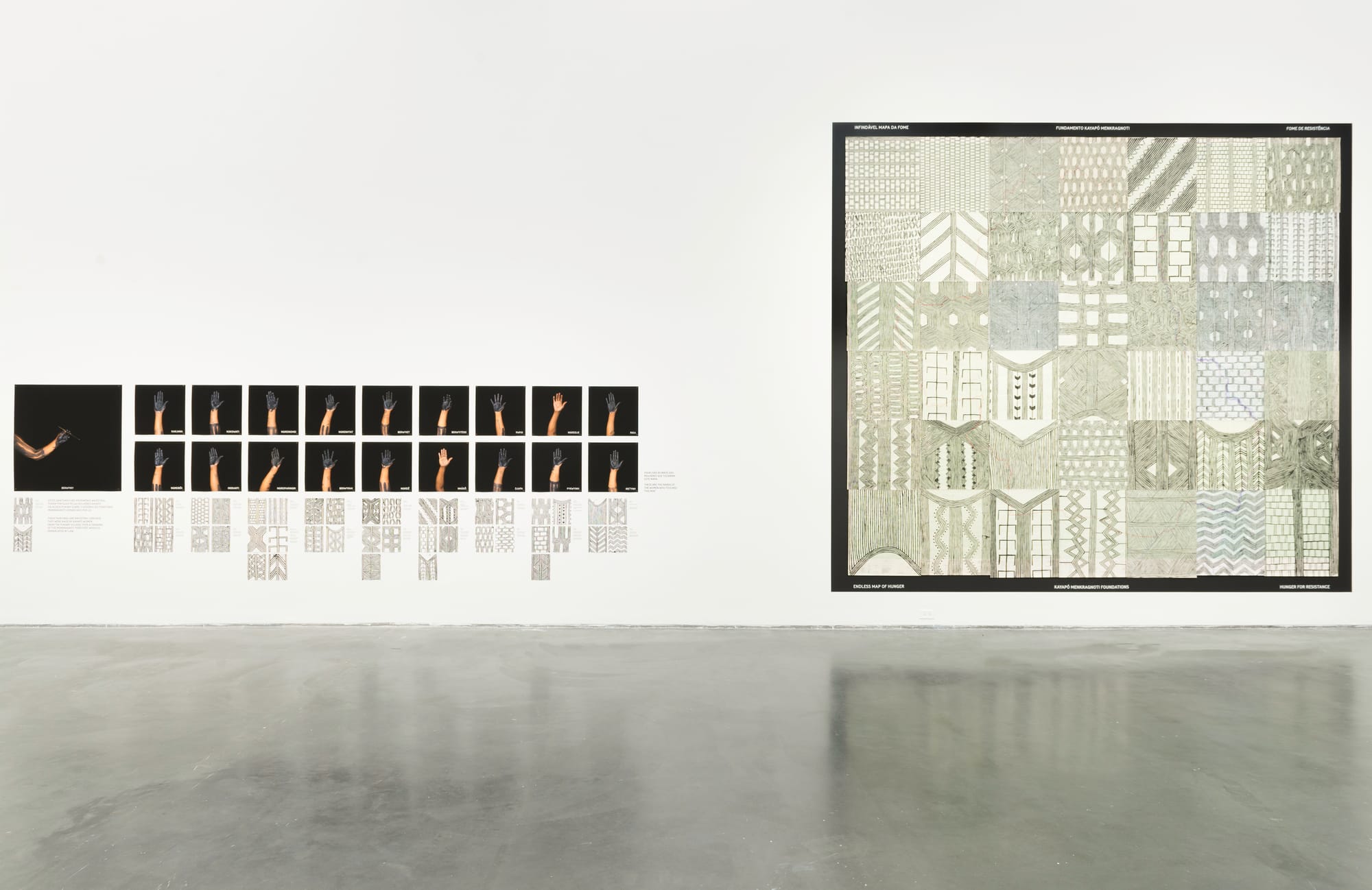 In another exchange, de Andrade collaborated with women of the Menkragnoti tribe known for their patterned body painting. For “Infindável Mapa de Fome” (Endless Hunger Map) (2019), these women reproduced their traditional imagery on Brazilian army maps of their ancestral lands in the Amazon, which the Brazilian state doesn’t officially recognize as indigenous territories. De Andrade pairs the maps with photographs of the women’s hands, an identification that resists subsuming them under hegemonic models of authorship. Infindável Mapa de Fome refuses to let its creators vanish into a western narrative of indigenous histories.