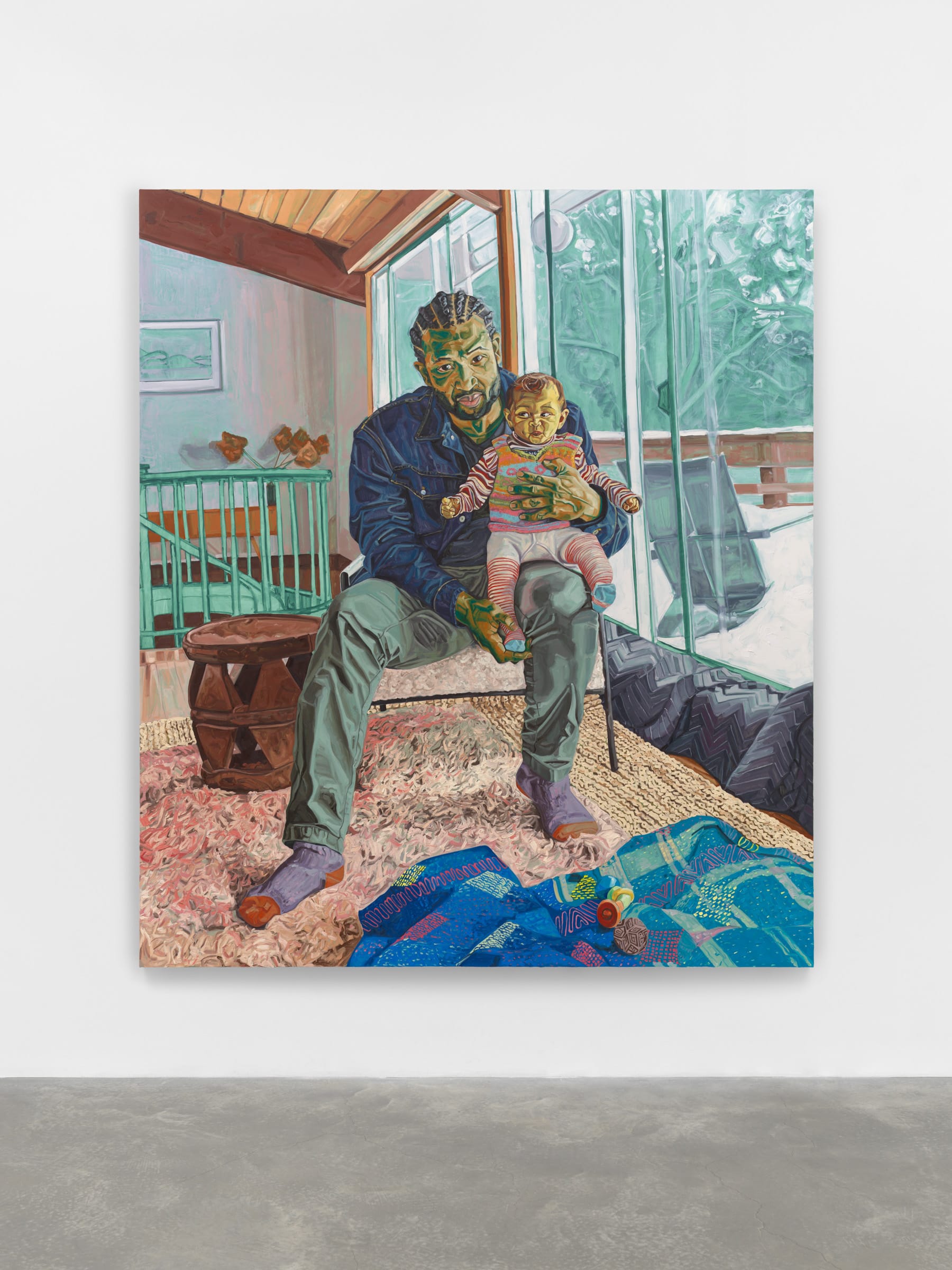 With “Damani and Shola” (2022), Casteel returns to a subject she has painted before, a young father holding his infant child. Three things, however, differentiate them from her previous representations of this subject. First, the painting joins an interior and exterior view: a large set of windows angles in from the the painting’s right side, showing a snow-covered back deck with trees growing beyond the wooden railing. Second, while Casteel has found many of her subjects in Harlem, this scene takes place somewhere else altogether. Third, and most importantly, the green markings on the man’s face, neck, and hands are not on the child he is holding. How are we to read these emphatic marks and their absence? I see the painting’s overt resistance to readability as new and deliberate. And while interviewers are likely to ask Casteel to explain the marks, I hope she never tells us.