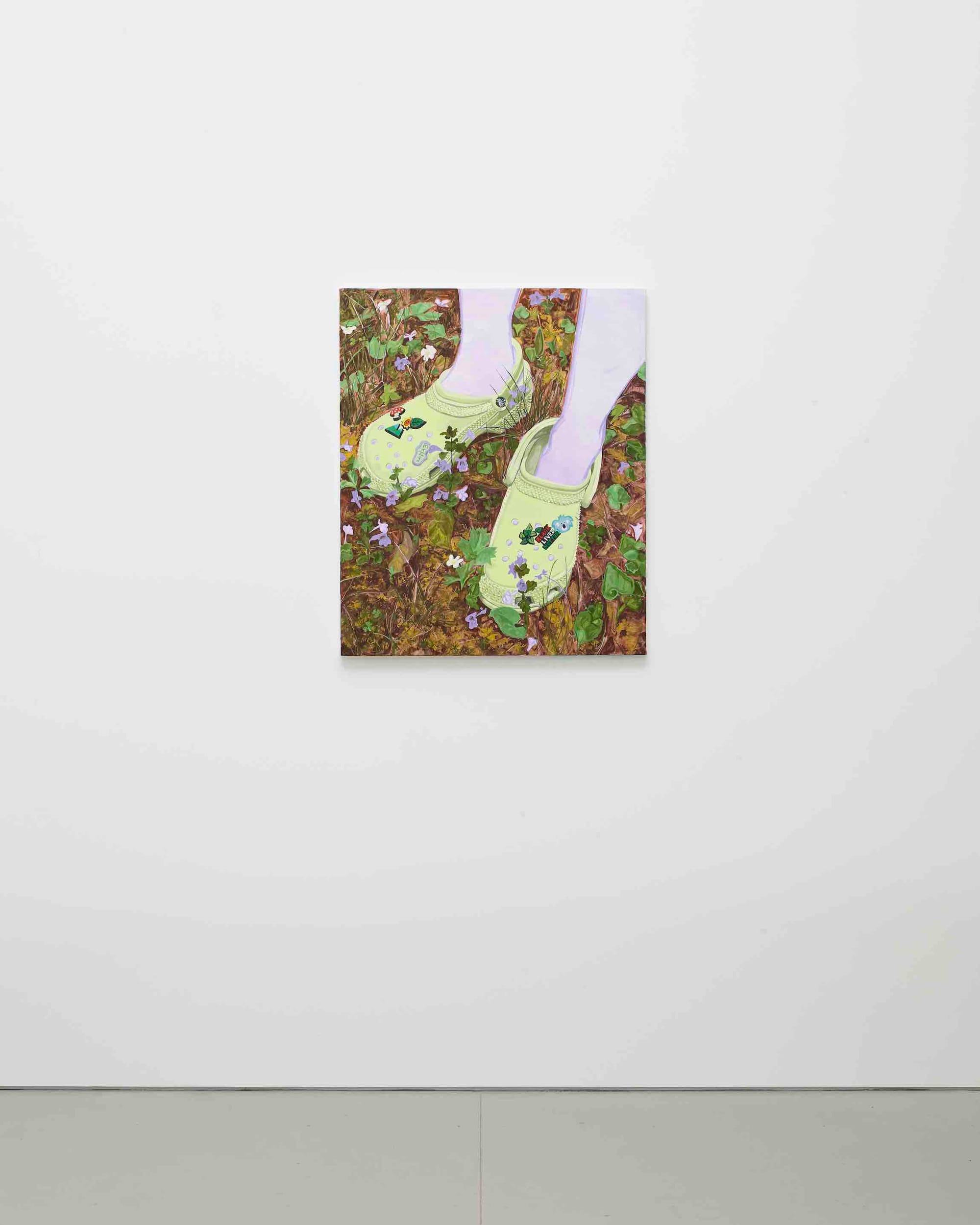 In “Field Balm” (2022), we are looking down at an angle at a pair of celery-green crocs worn by what seems like an adolescent girl of undetermined race. She stands on a patch of brown autumn leaves, weeds and plants growing through the ground cover. The bare legs — cropped at mid-calf by the painting’s top edge — are lavender, edged in violet. A pin bearing the phrase BLACK LIVES MATTER in red, white, and green is attached to one shoe, while word EXPLORE, and a pin of a red and white mushroom (amanita muscaria) often found on Christmas cards and known for its hallucinogenic properties, are on the other. The combination invites interpretation. What do all these things suggest about the child’s options?