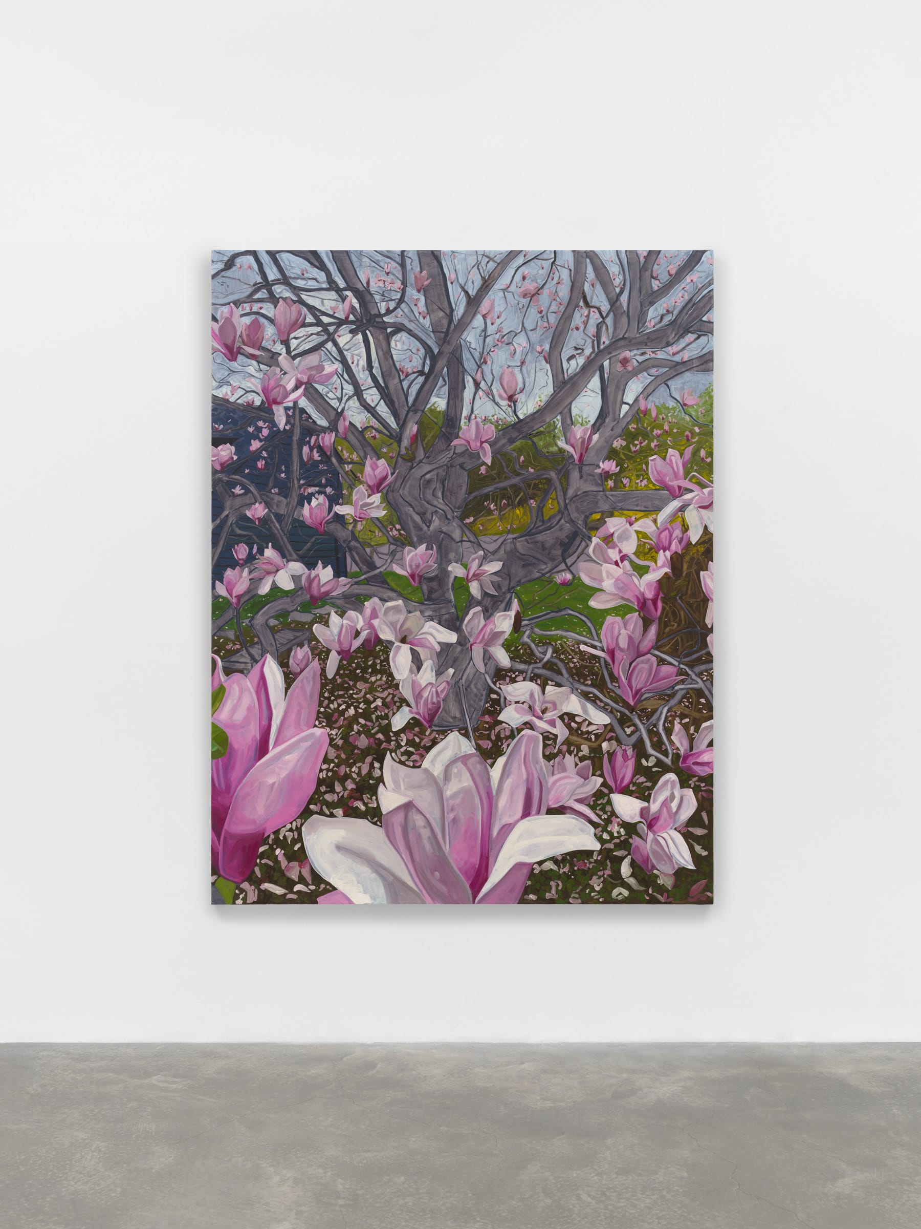 “Magnolia” is in dialogue with Vincent van Gogh’s paintings of blossoming almond trees, such as “Almond Blossom” (1890), and his engagement with Japanese art. In this odd view, the top of a large pink and white magnolia blossom, rising from the painting’s bottom edge, stops just short of touching the bottom of the tree in the middle ground. A petal, rendered as a dab of pink, separates the two. Around the tree, paint strokes articulate fallen magnolia blossoms. Casteel has become increasingly comfortable moving between abstraction and description, and the traces of stiffness in her earlier work are fast receding.