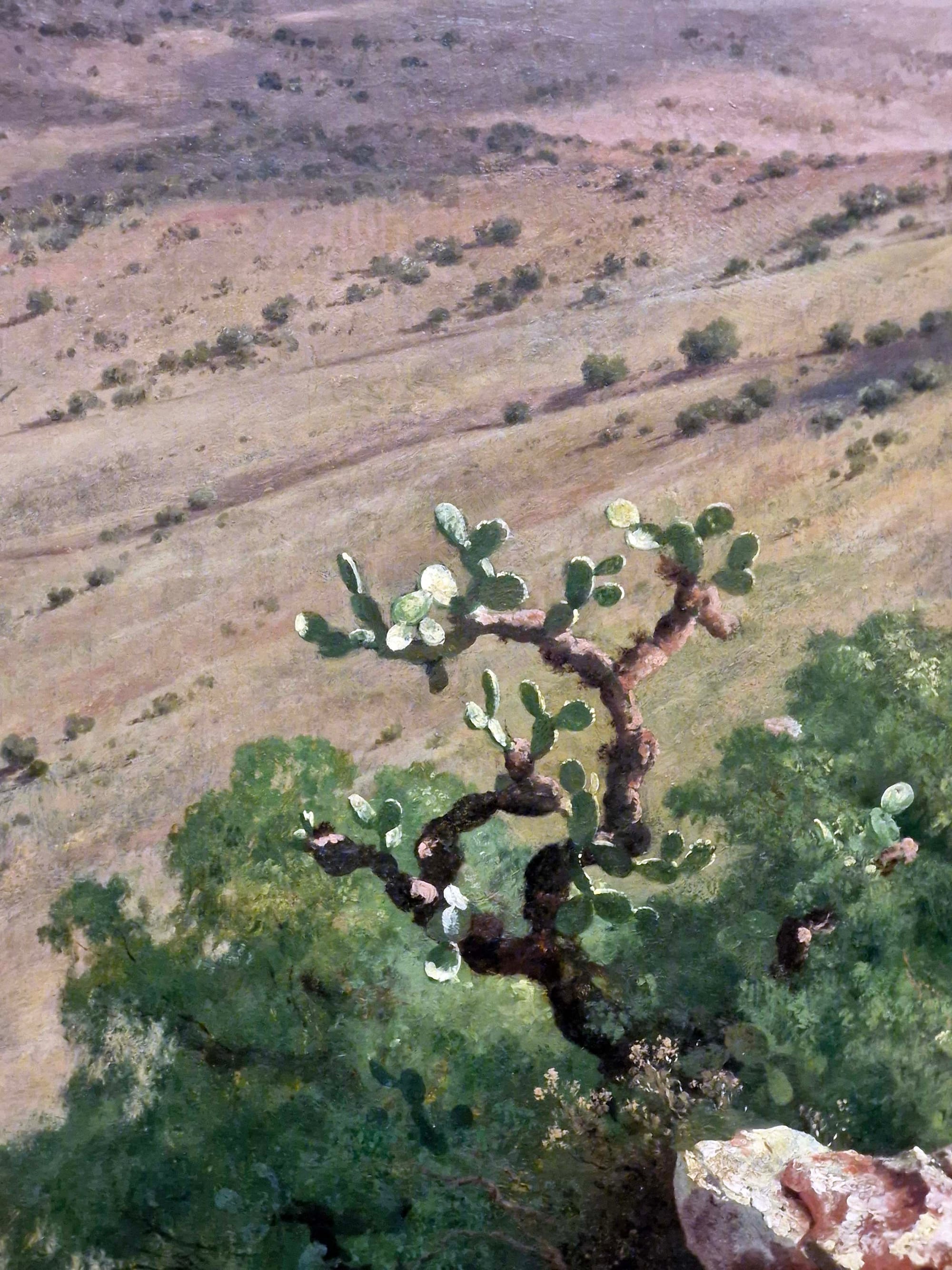 The paintings are quietly grand in their monumental scale, rather than visually bombastic. Where narrative landscapes typically construct depth via artificial layers like scenery on a stage, Velasco’s vistas — clearly recorded in situ — employ staggering technical draftsmanship to induce a vertiginous sense of a precipitous drop: His epic “The Valley of Mexico (View of the Valley of Mexico from the Hill of Santa Isabel)” (1877) seems to sweep down away from our feet. Cloud shadows across distant mountains are a naturalistic detail few narrative painters would think to include. As in botanical work, oil glazes are rare, lending the colors an opacity and hardness that captures the dryness of the Mexican scrubland.