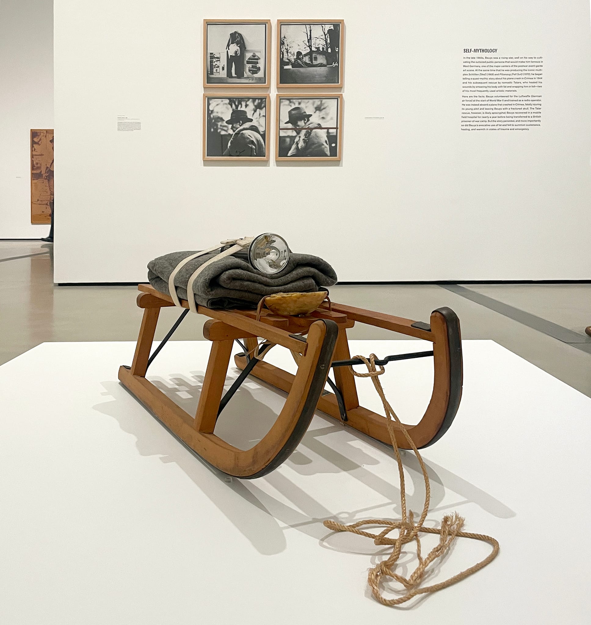 Upon entering the main gallery, the first object viewers encounter is “Schlitten,” a convincing replica of a World War II-era military sled. A felt blanket and flashlight are strapped to the device with tan utilitarian belts. The item is inspired by Beuys’s own military service, which ended with a plane crash in Crimea in 1944. He claimed that nomadic Tatars found him and kept him warm by wrapping him in fat and felt, which became two of his favorite materials over the course of his career.