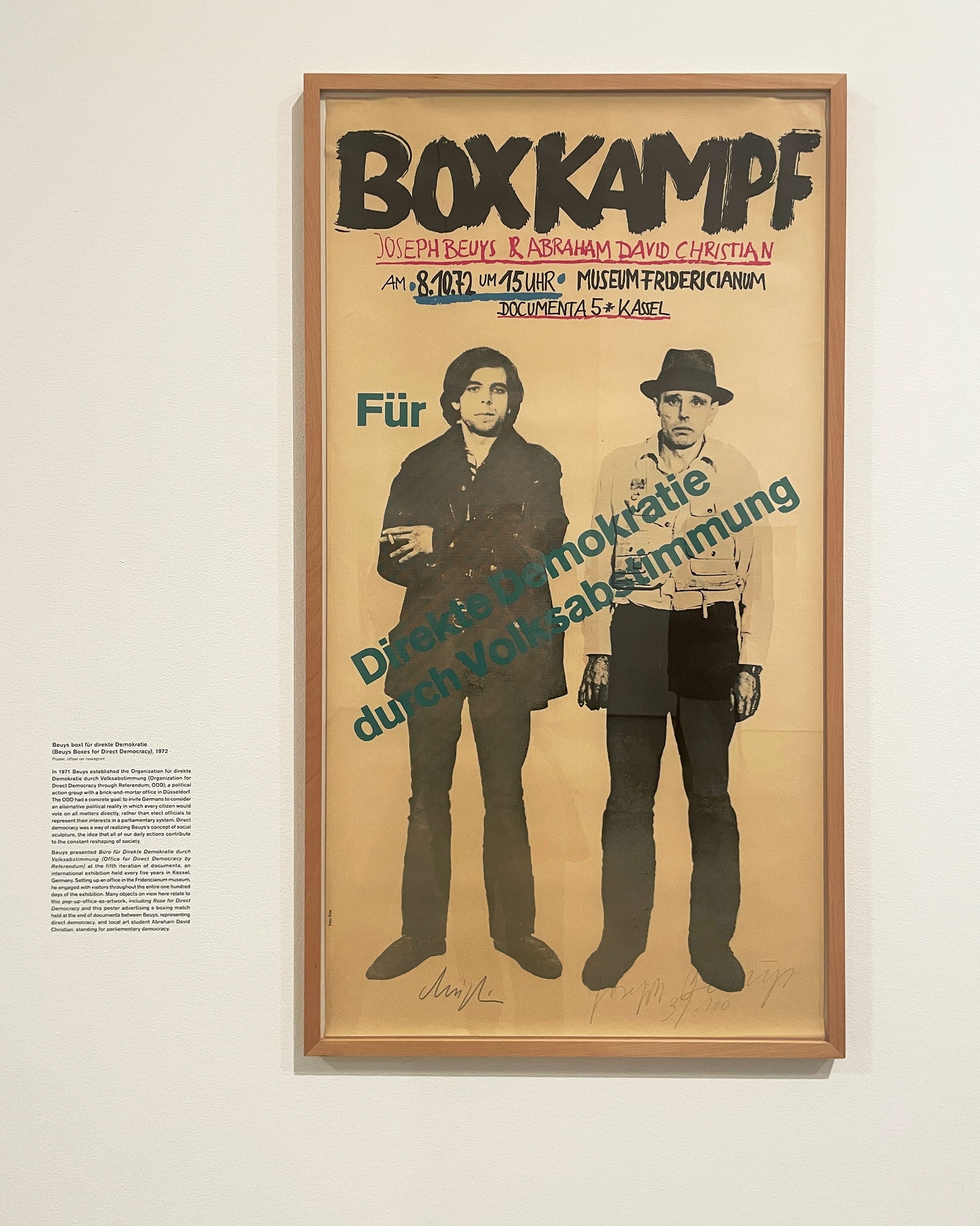 Beuys could also point to his military service and say it radicalized him against fascism. Even though he had his links to the Nazi party, which the show glosses over, he would cement himself as a leftist in “Beuys boxt für direkte demokratie.” In a bout that took place at documenta 5, the artist, advocating for a direct voting system, fought a local art student, Abraham David Christian, who was the stand-in for parliament. Beuys won.
