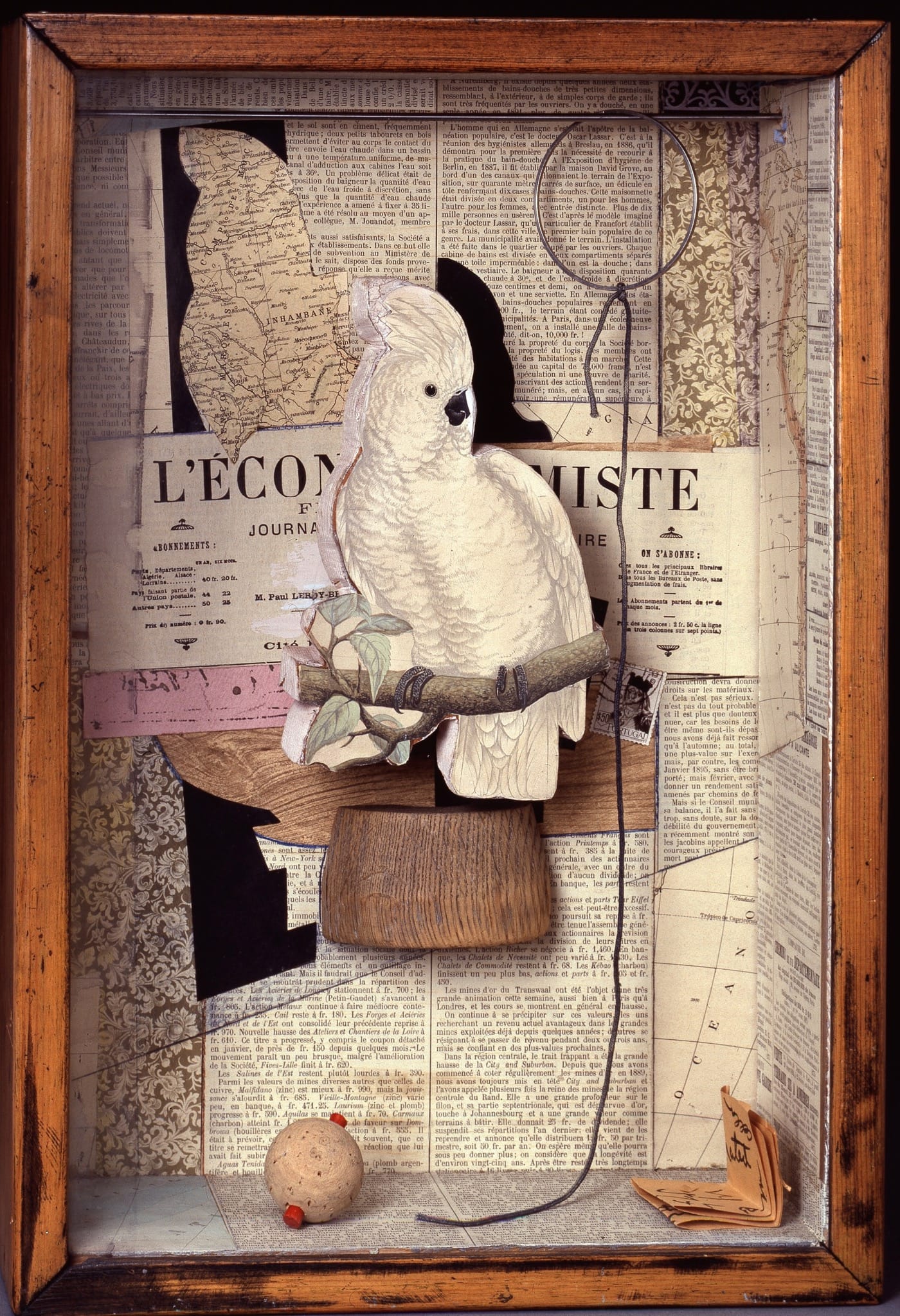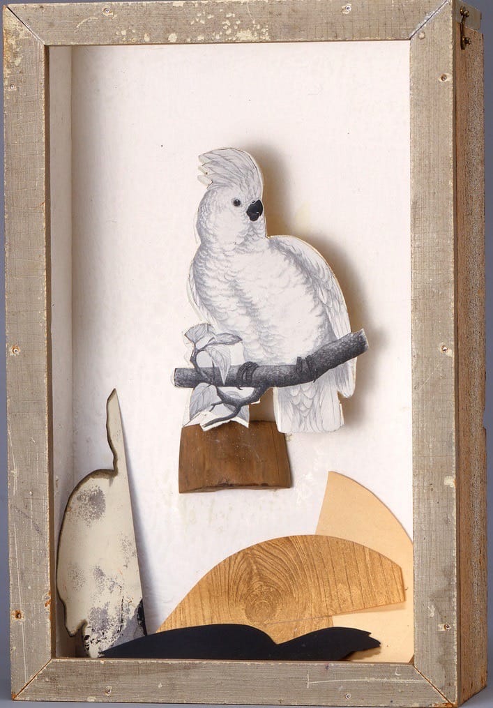 Cornell takes up this provocation, all the while uncovering fragments of the Spanish painter’s life behind his art. Like Gris, he blurs the “fake” and the “real”: a paper bird rests on a wooden perch. His Gris series abounds in verbal and visual playfulness. By choosing the white cockatoo as the protagonist for his series, Cornell announces his intention to “parrot” Gris. Labels emblazoned “La Estrella” point to the “star” of the show.