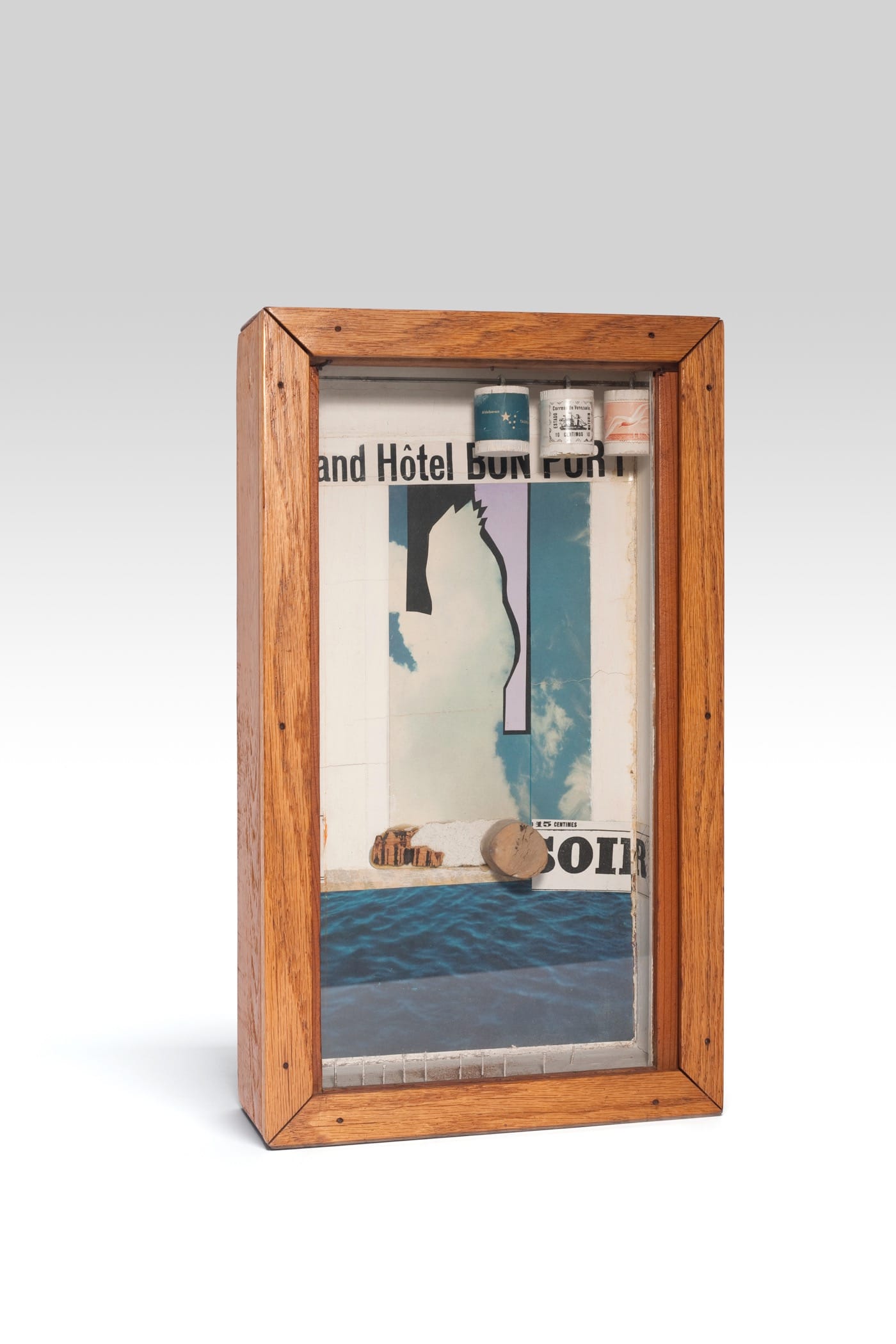 “The Man at the Café” depicts a seated figure almost entirely obscured by a newspaper. Only the top of his hat appears. The front page bears the headline “The Berthillon Method / One will no longer be able to make fake works of art,” a reference to art forgery that Cornell plays on by incorporating real materials like newsprint, while also studiously mimicking the wood grain of the table with oil paint.