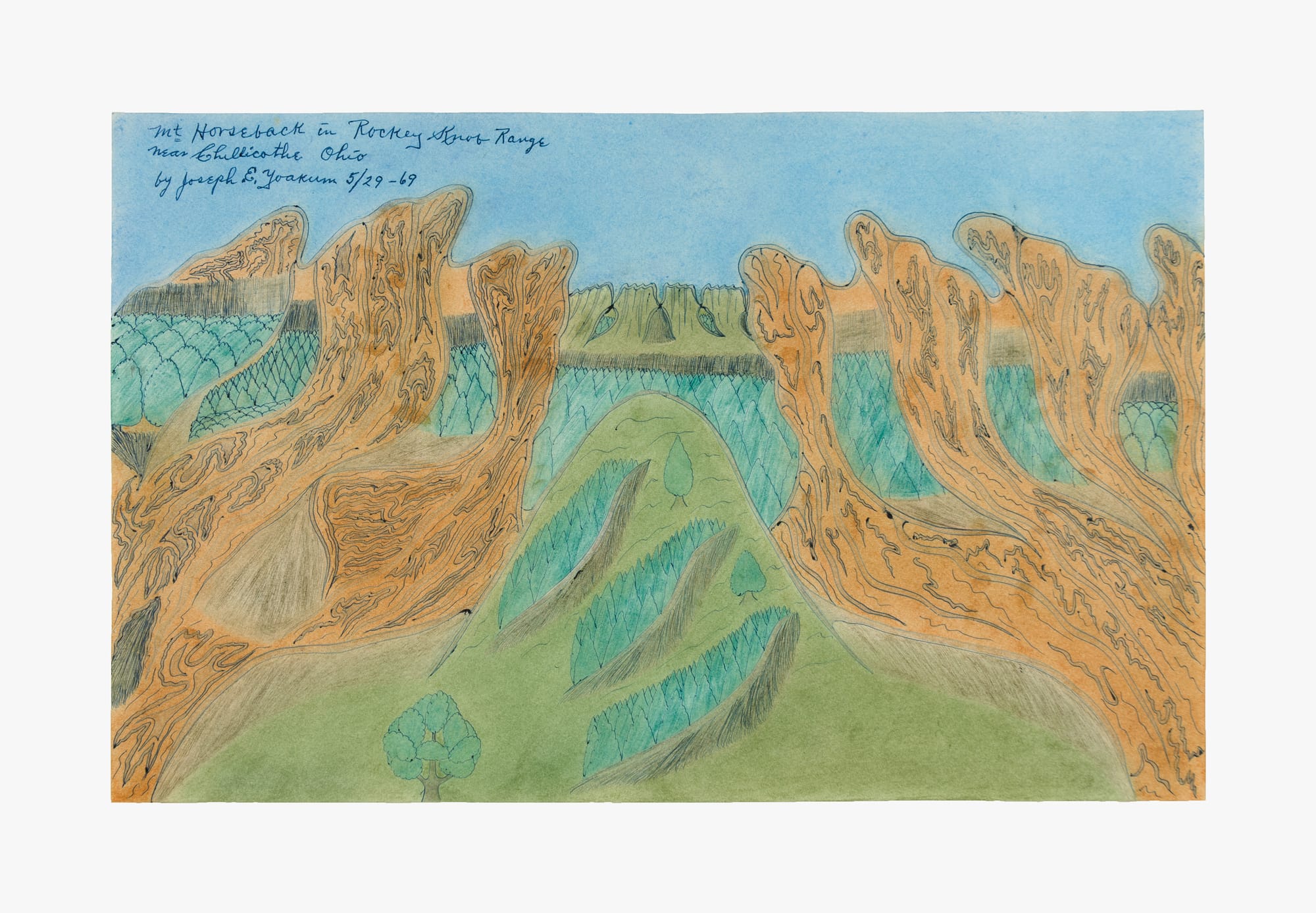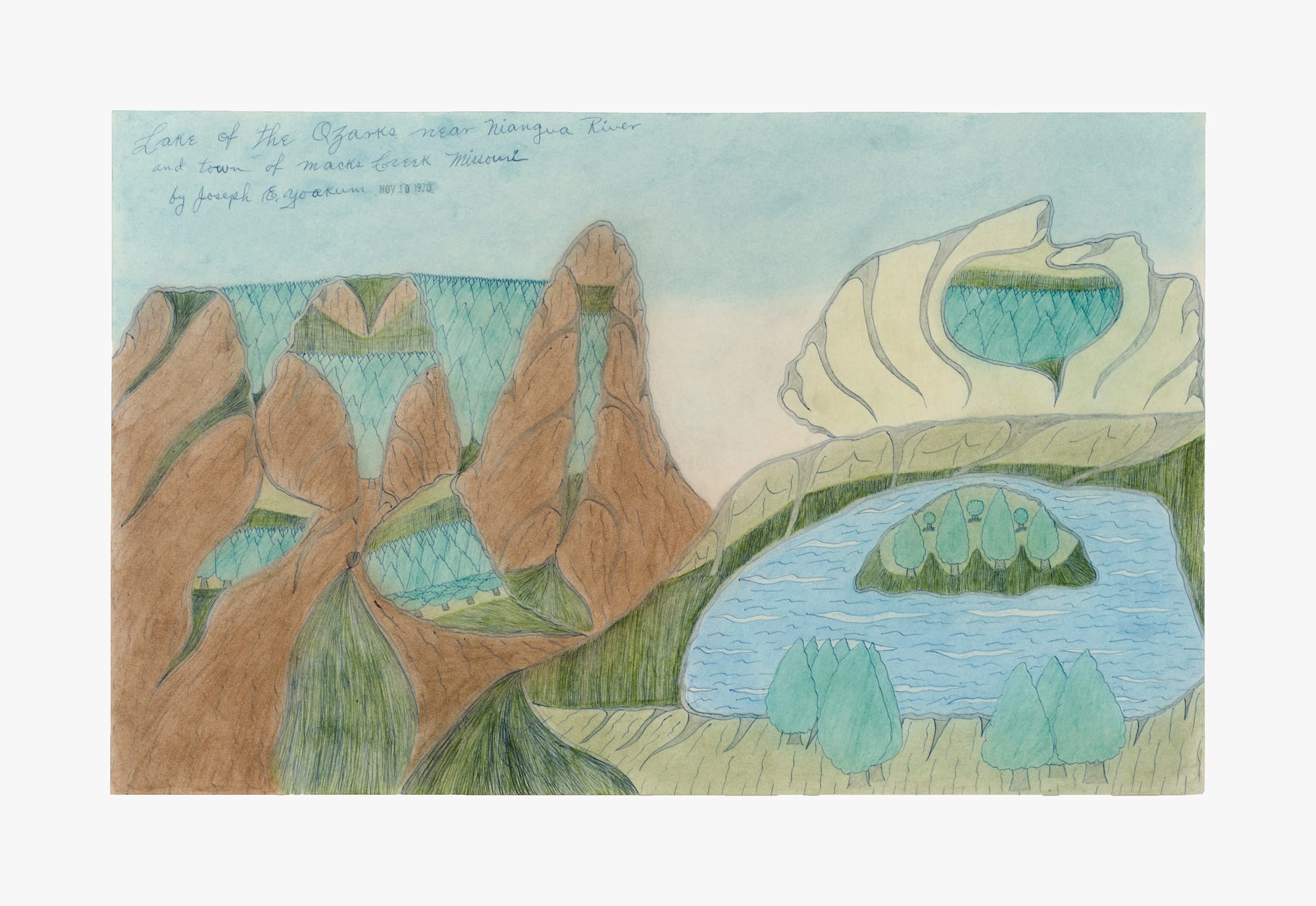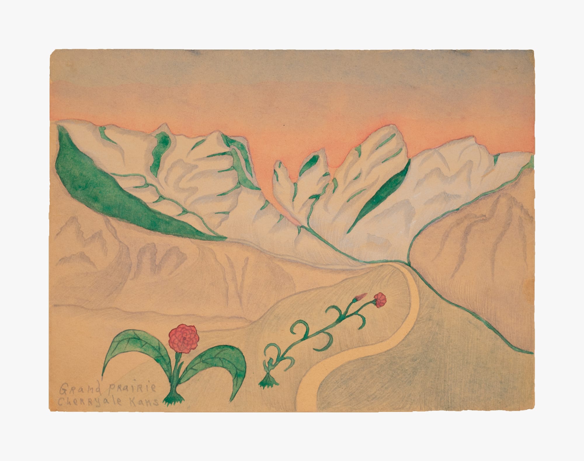 The most striking thing about Yoakum’s drawings is their visionary quality: the all-over transformation of sight with patterns and visual rhymes. In “Grand Prairie Cherryale Kans” (nd), gently shaded M shapes and S shapes repeat like echoes scudding through the valley, while emerald patches of water rivet the eye against the peachy sky. The petal-like contours of the mountain, leaning flowers, and the winding path all converge to one point on the center-left, anchoring the composition.