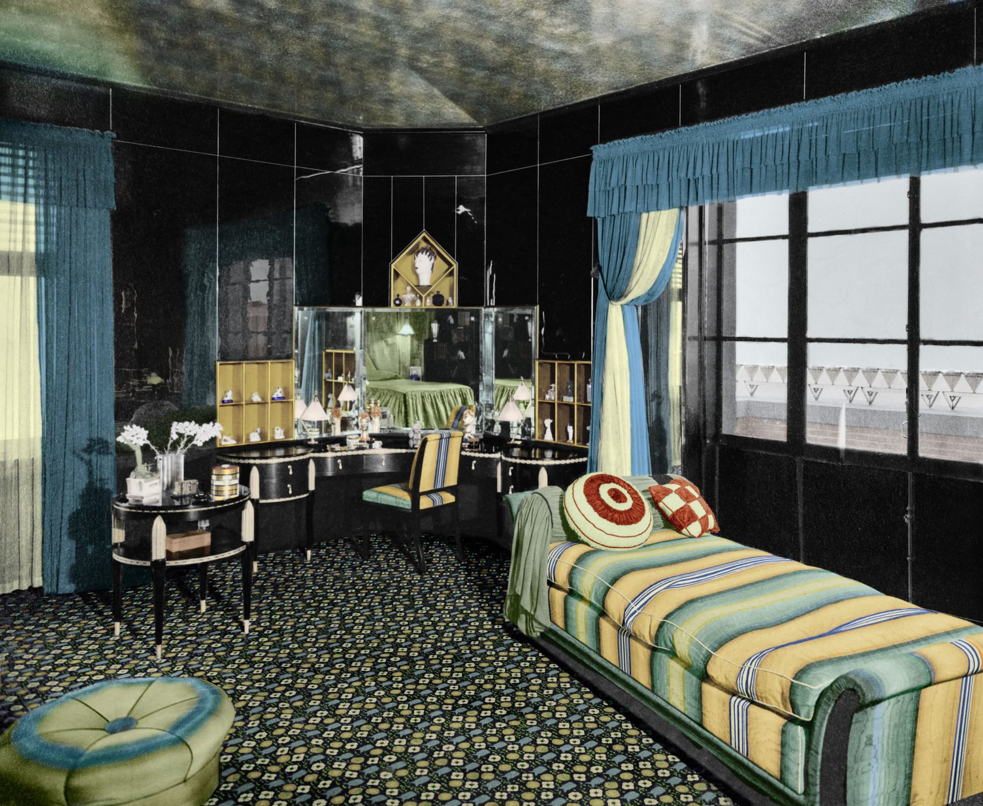 As Urban’s designs proliferated in public spaces across the country, American consumers slowly warmed to the sharp, sleek look of modernism. Some benefactors, like the Wormsers, chose to dip their toe into the aesthetic by commissioning a single room in the style. In this and other projects, Urban drew from his experience with theater and cinema to create colorful, dramatic interior spaces. In Wormser’s room, for example, the chartreuse bed sits in front of a wall of curtains on a raised, proscenium-like platform surrounded by polished black walls. Writing about another of Urban's bold boudoir designs, a critic mused that the room had “a strange and very beautiful effect, though to me almost too astonishing.”