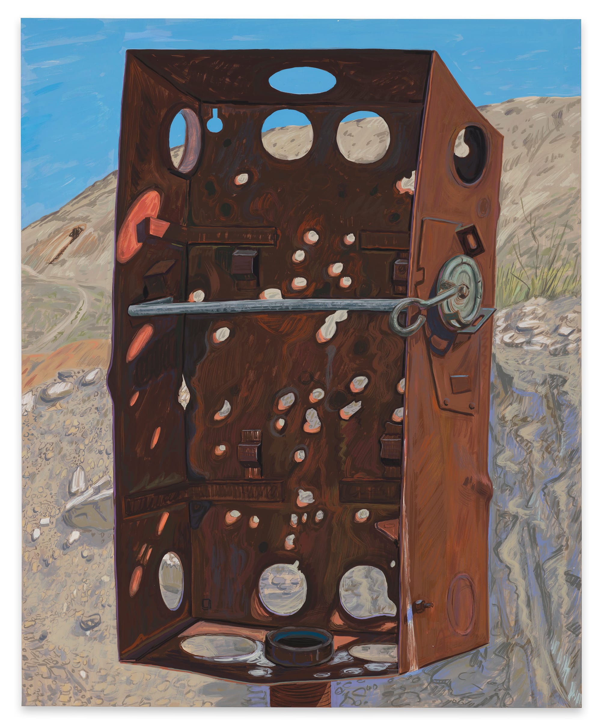 In “Buried Barrel,” “Army Heater,” and “Disconnect Box” (all 2022), Halvorson depicts things that are outdated and abandoned. They are relics from earlier technology. We live in a world where obsolescence is part of the process. That process, which is intrinsic to capitalism’s notion of progress, is one reason why she picks these forlorn, forgotten, mute things; she wants to us reflect upon how they affected those who built them. What is the human cost in a society predicated on efficiency and desuetude?