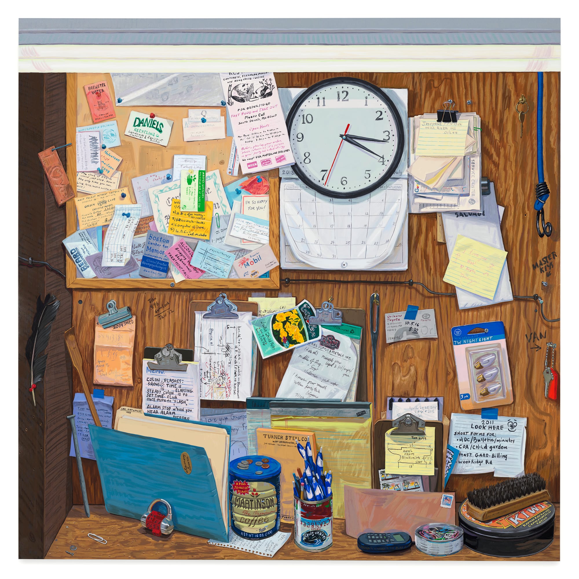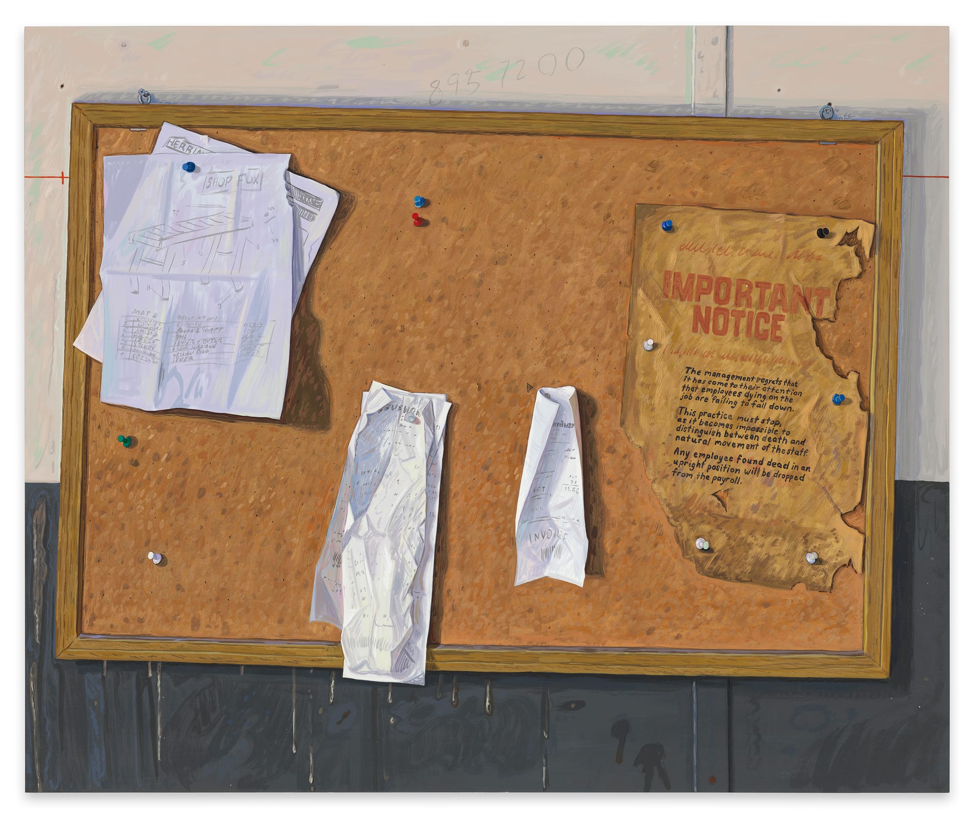 Everything about the painting is straightforward, while everything in it is off kilter, bizarre, and inexplicable. Who posted this? The bulletin board, which hangs at an angle, seems to have been abandoned in an unused office space. How does the meaning change now that it is no longer being used, having died in an upright position? Circumstances change and the meaning of things shift. Halvorson is attuned to this.