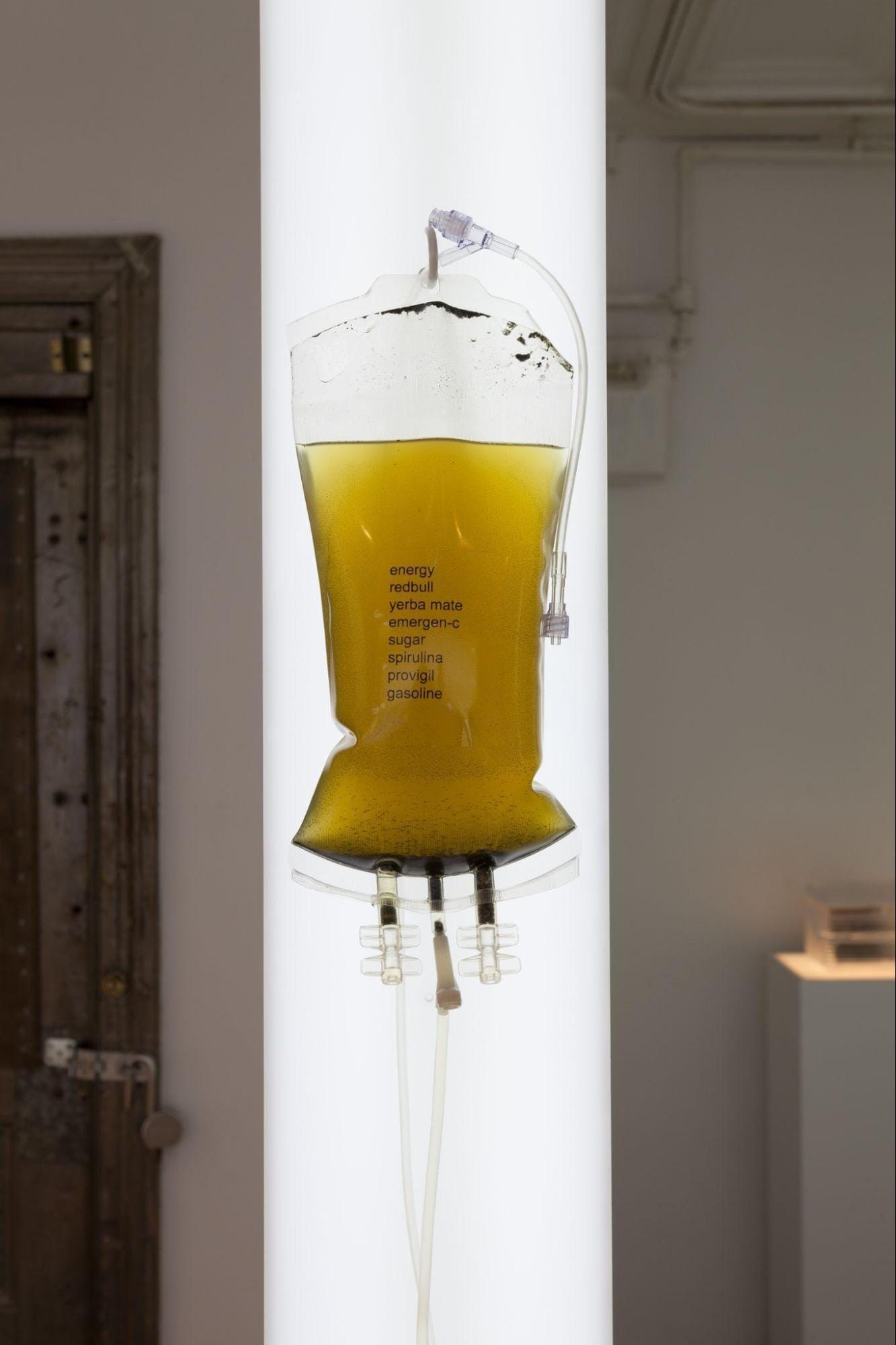 Overmedication: IV drip bags with liquid labeled as mixtures of Ritalin, Red Bull, espresso, and other prescription medications and supplements.