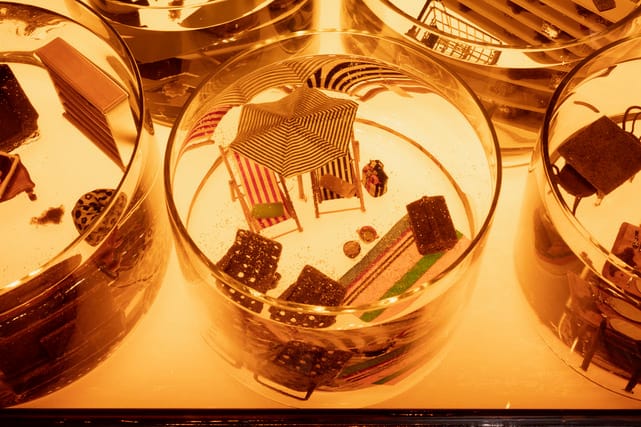 At least in its first Part, Climate Change posits no such alternatives. The three sculptural installations in the exhibition’s final room — refrigerator-sized lab hoods whose light box chambers display tableaux of dollhouse furniture suspended in containers of formaldehyde-like fluid (“Erosion,” “Submersion,” “Inundation,” all 2019) — merely preserve traces of today’s civilization as though they were scientific curios or time capsule specimens. While the concept yet again lacks sharpness, the artist’s use of color, scale, content, and materials has the eeriness of Kline’s best symbolic perversions. The lab hoods’ fluid-logged dollhouse habitats, twice-entombed and glowing, are uncanny reminders of our civilization’s deer-in-the-headlights stuckness when it comes to restructuring itself so as to mitigate anthropogenic climate change.
