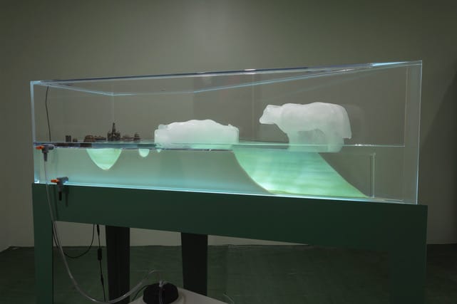 The artist imagines a future in which an Antarctic ice sheet has broken, resulting in a catastrophic sea-level rise.