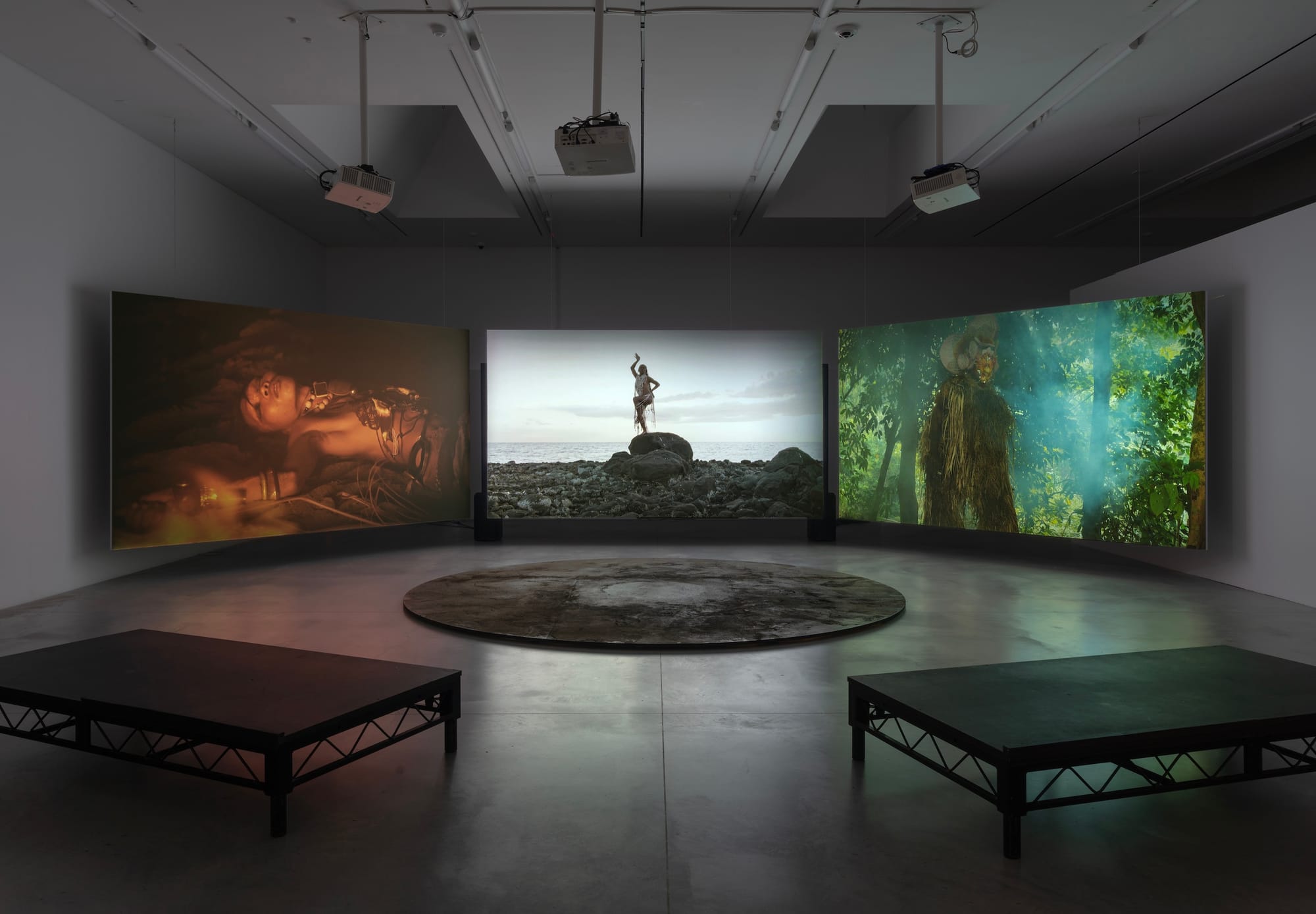 While "VOID" created a space to look inward, Serafin sought to open an invitation to a collective of trans people with the other iterations. The three-channel video “Creation Paradigm” (2023) straddles inward and outward manifestations of spirit work. In devising the piece, Serafin asked performers Bunny Cadag, Lukresia Quismundo, and Alaga to envision their embodiment as a divine entity. Within a crescendo of elemental rituals, the video locates possibilities of trans joy not only in an optimistic future, but also in pre-colonial pasts where trans and nonbinary people were celebrated as channels of divinity.
