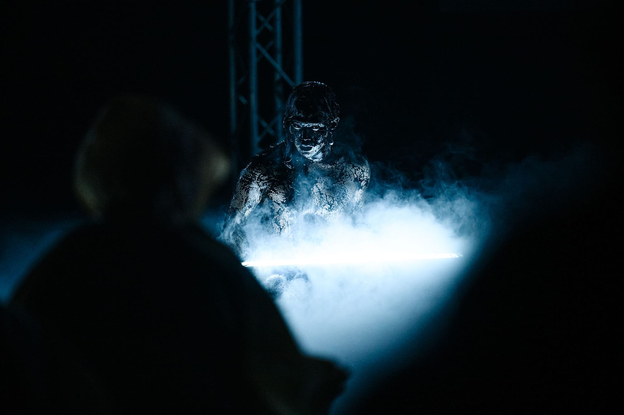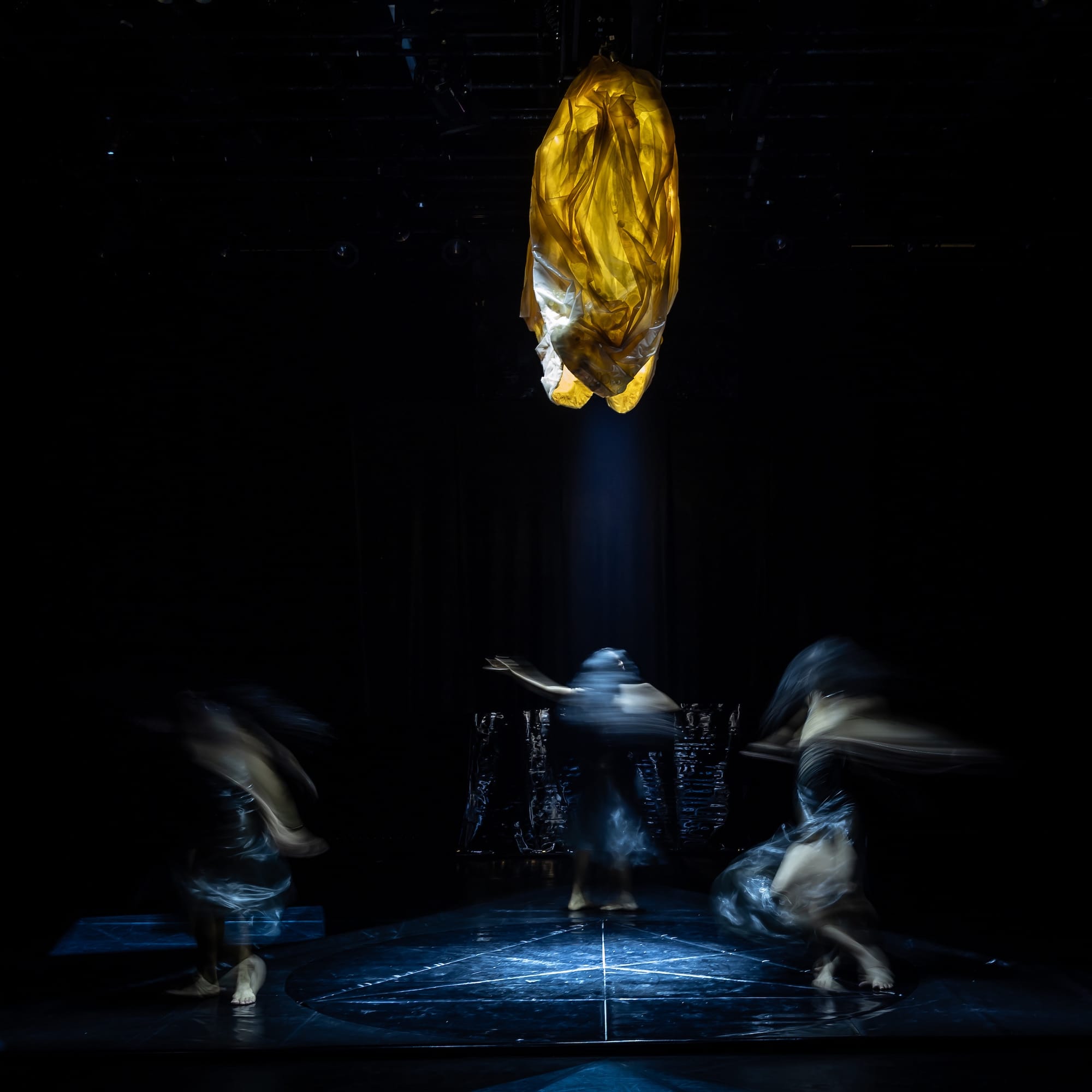The second act of PEARLS features a glowing pupa suspended over the stage coming to life, pouring a stream of ethereal flesh-hued slime onto a triangular base. This slime — crafted and refined by Serafin over many years in a way that allows them to skilfully wield it — is a highlight of the trilogy. The "primordial mud," as the artist calls it, becomes the non-human fourth character that binds the performance together. Jubilantly spinning the slime in their hands before launching it up in the air, playfully throwing at one another, the performers reclaim the stage as a sanctuary outside the horrors of cis-patriarchal society.