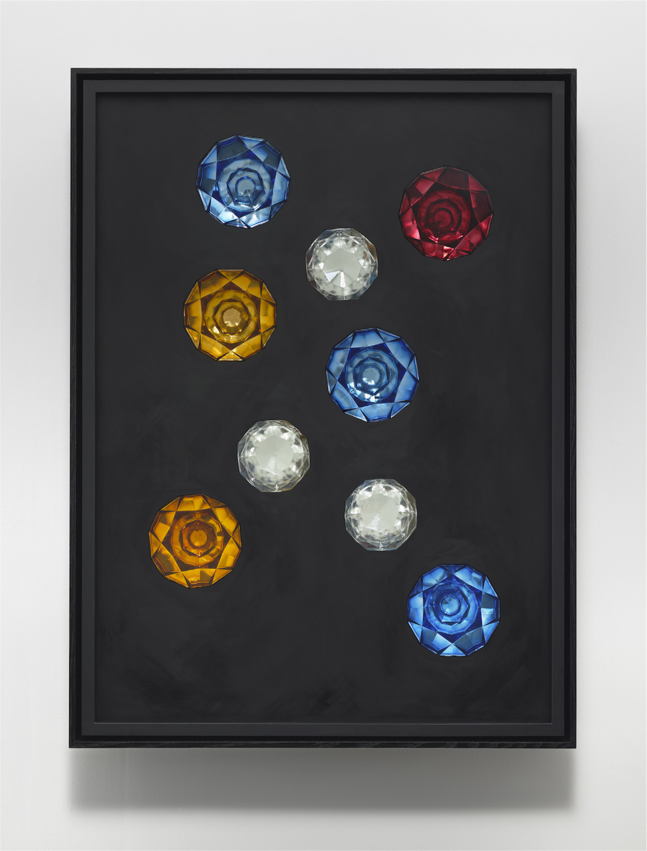But for now the gems remain, like Kryptonite (or like any color-shape on any Constructivist painting) creating hypnotic zones of reflection and refraction seamlessly lodged within an opaque ground — a smothering shadow— of black matte paint.