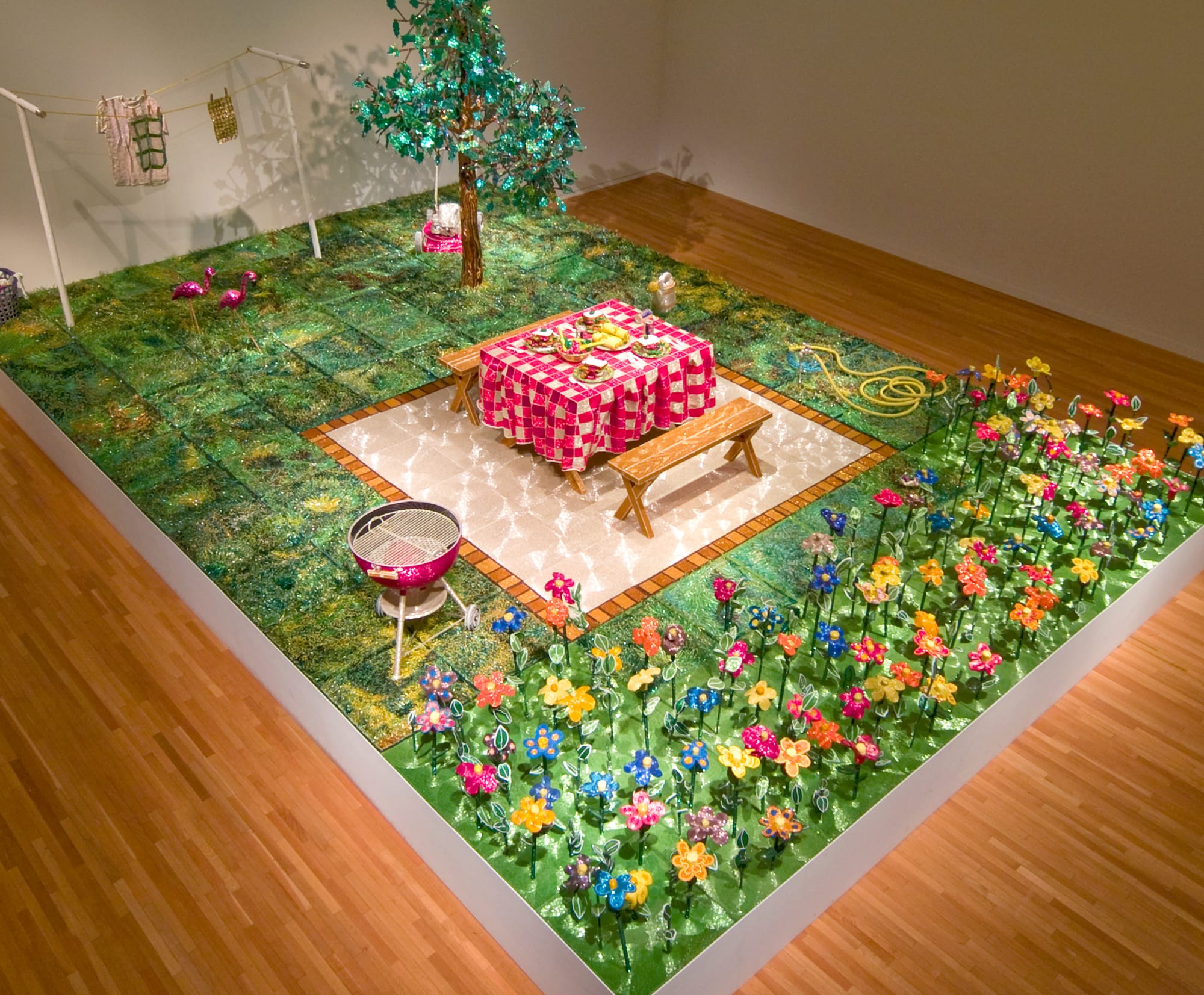 Liza Lou, "Back Yard" (1996–1999), glass beads, sequins, wood, wire, plaster, found objects, 264 x 288 inches (Fondation Cartier pour l'art contemporain, Paris, image courtesy the artist and Lehmann Maupin, New York, Hong Kong, Seoul, and London)