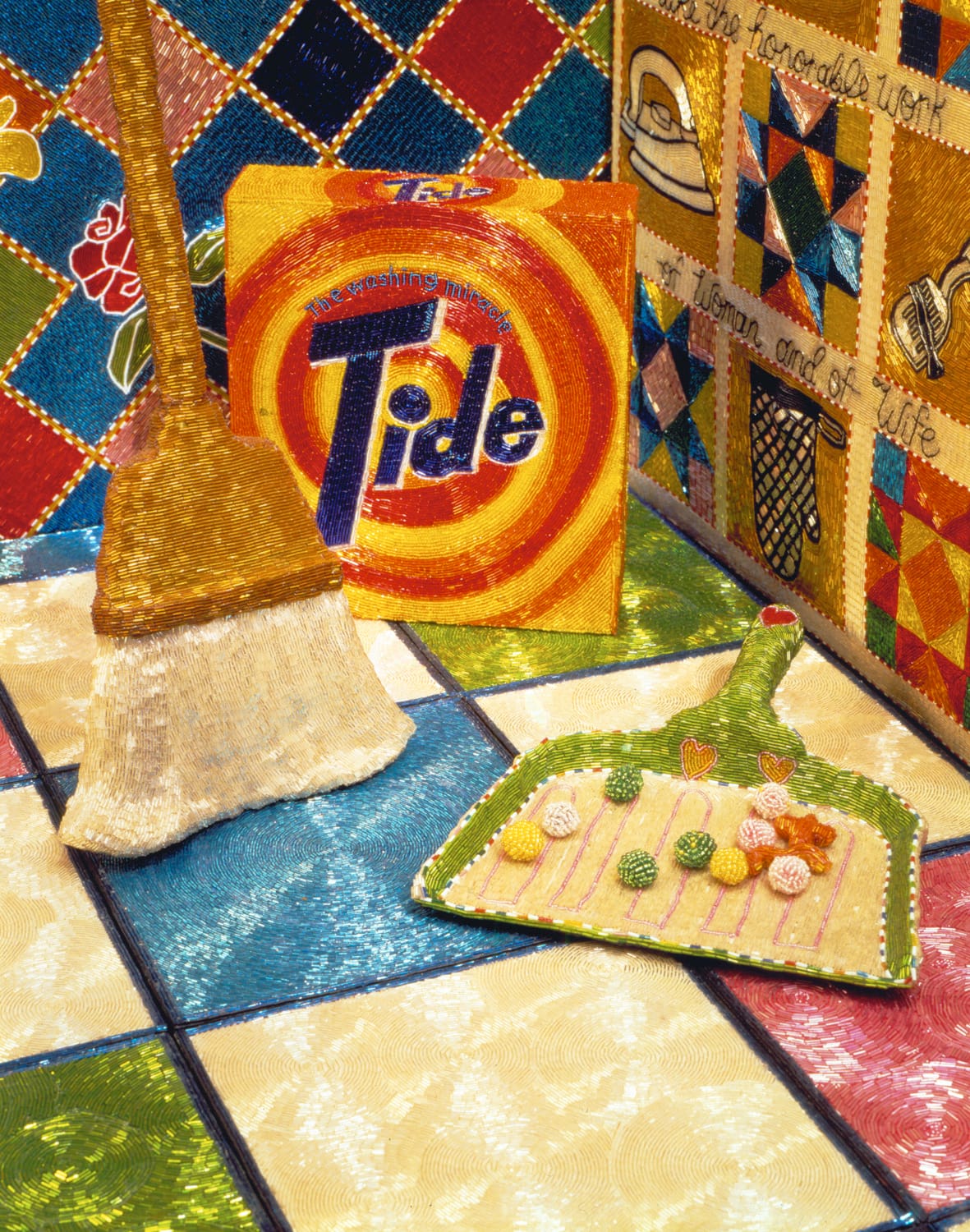 The 168-square-foot installation, a monument to unrecognized women’s labor, started off as a riff on Pop Art, as seen in the razzle-dazzle brand-name cereal boxes and cleaning products scattered throughout the scene. But over the years of making the work, Lou became increasingly activated around feminism and started to see beads as a metaphor for the female experience: “small, pretty, diminutive, decorative — those sorts of things that are kind of pejorative that we have around femininity, around women,” she said.