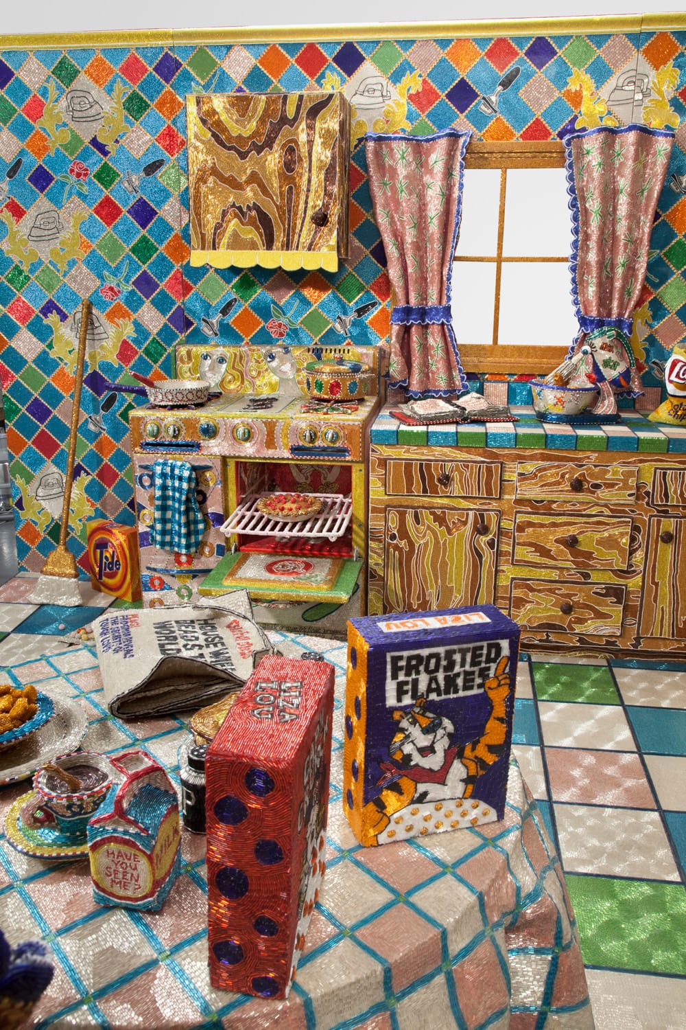The seductive beaded surfaces glitter under the gallery lights of the Whitney Museum of American Art. Museum-goers pause and murmur to each other, wondering how it was made (by meticulously glueing beads by hand, one-by-one, to found and fabricated kitchen elements), how long it took Lou to make it (five years), and pointing out favorite details: a beaded grocery list, a beaded dustpan full of beaded detritus, swirls of beaded water streaming out of a beaded faucet.