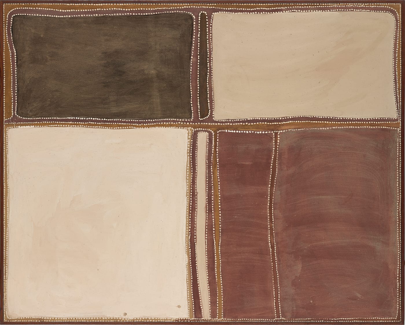 Most works here offer abstract interpretations of “the Dreaming,” or “Tjukurrpa,” an archive of stories about the world’s creation by ancestral beings. Central to these narratives is an understanding of time as a cyclical and circular order. “One cannot ‘fix’ the Dreaming in time; it was, and is, everywhen,” wrote Australian anthropologist William Stanner.