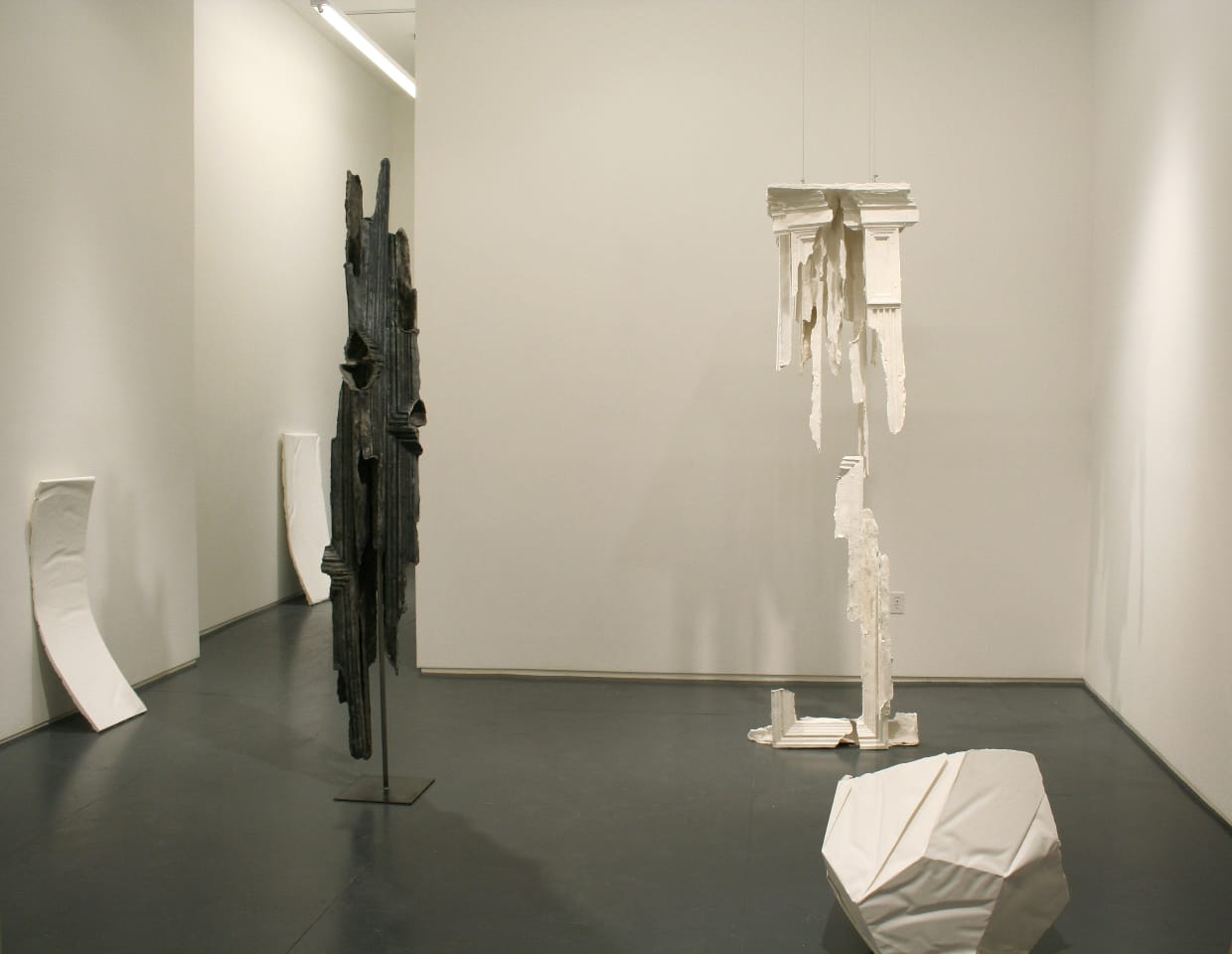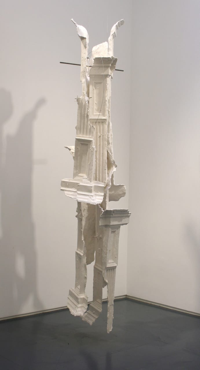 By attaching, combining and hanging the casts together in quasi-architectural formations, Curtis’ sculptures recall the remains of ancient ruins, like those we find in the Classical wing of the Metropolitan Museum. Curtis is particularly interested in the inherent chemical and mineral components of the material she works with, calling attention to her lava and boron-based Fiberglass, gypsum (plaster) and Portland cement, also known as Hydrocal.