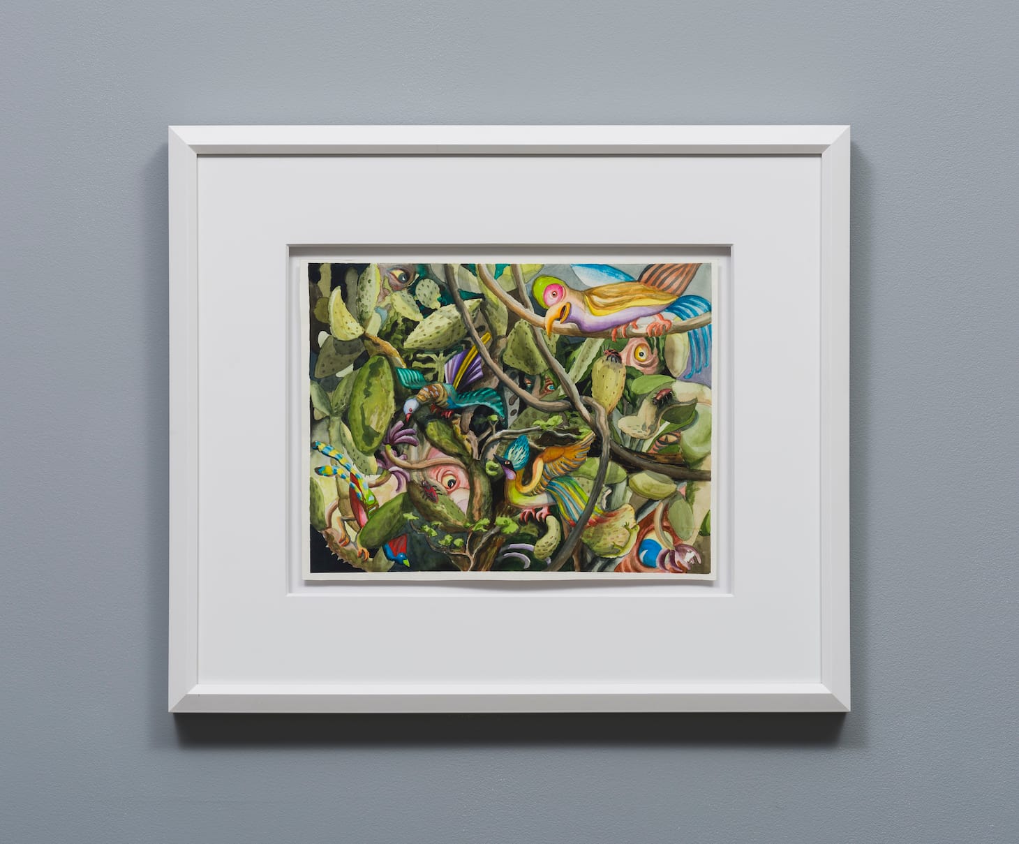The protagonist’s journey mirrors Pitt’s own experience with depression from which she found relief by traveling to the rainforests of Central America on a Fulbright Grant. There she made the nine paintings exhibited for the first time in Joy Street and experienced a break from her depression that became the basis for the animation’s storyline. What could easily become a tired, problematic narrative of the Western artist traveling to an exotic country on a mission for self-discovery is tempered by the emotional frankness of the work.