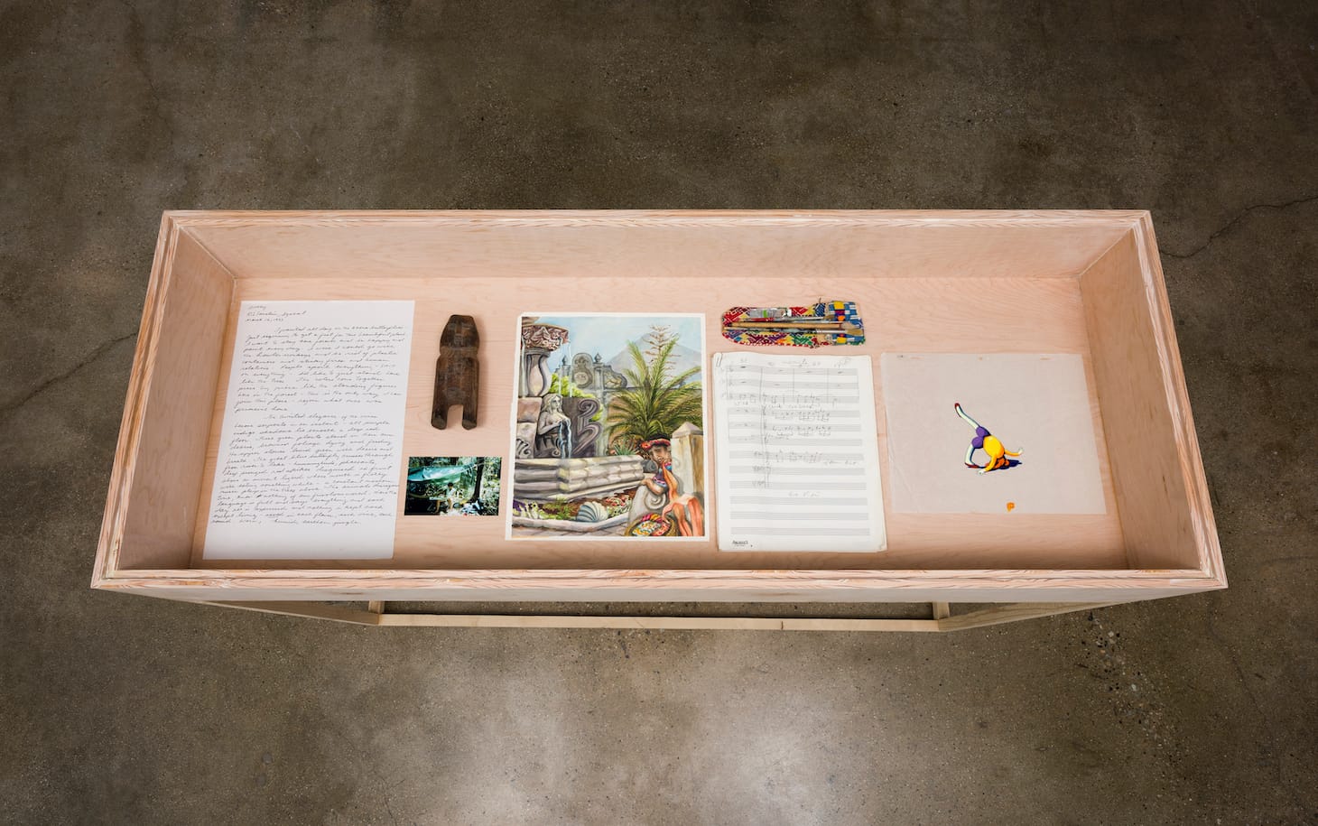 Some elements of the exhibition feel unnecessarily stagey, such as a vitrine in the middle of the room which houses various objects from the making of the animation, including a picture of Pitt drawing in the rainforest and some musical composition notes. The vitrine, not listed as an artwork on the checklist, seems to lend the exhibition an air of importance, much like a museum display case would. But Pitt’s work speaks for itself and, in my view, doesn’t need props to justify its existence. The topics Joy Street brings up, such as mental illness, urban density, and environmental concerns are relevant on their own.