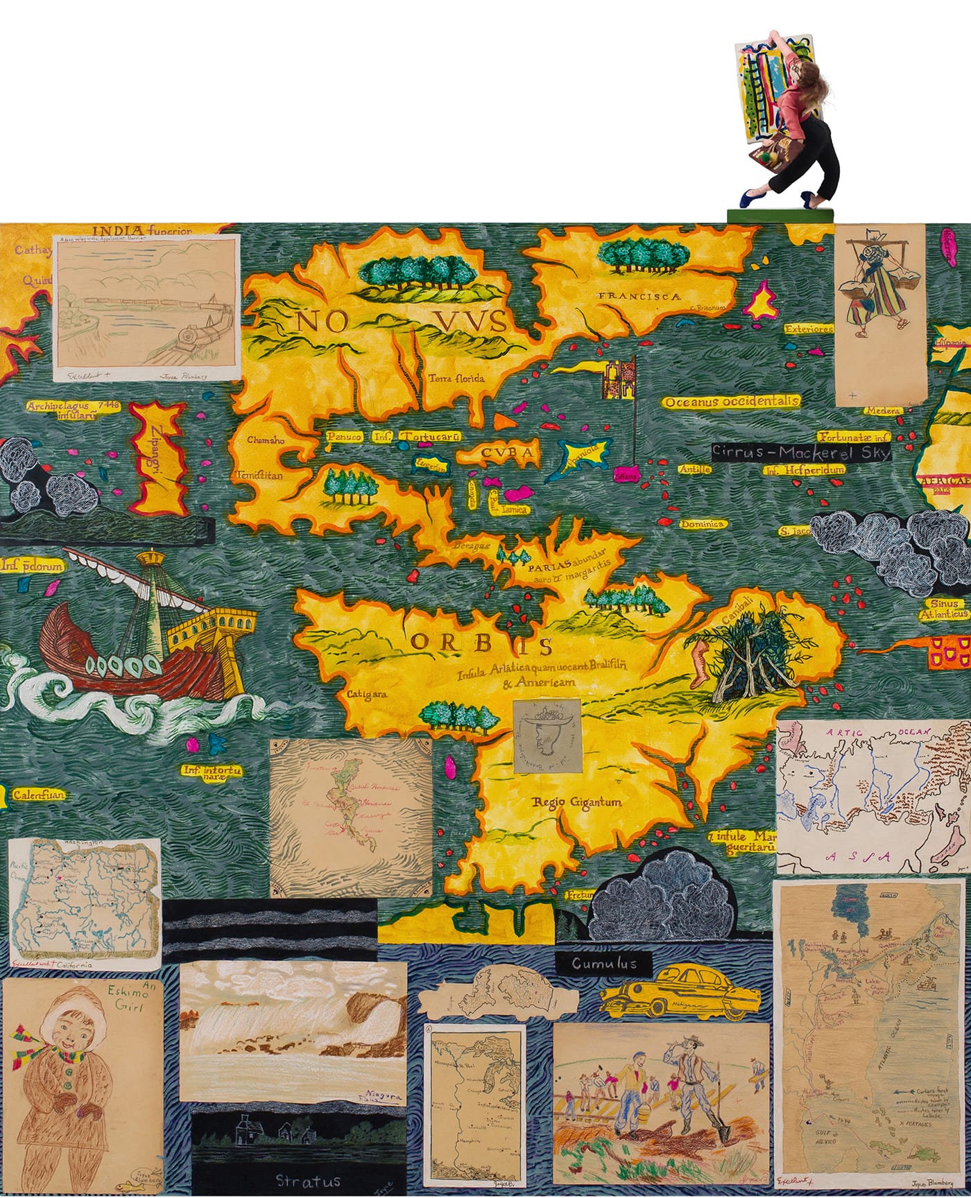 For example, in “Art Girl” (2017), an ancient map of North and South America barely follows the outline of the geography that we know today (it locates India somewhere to the northwest of Alaska). The land mass forms a backdrop to Kozloff’s elementary-school depictions of Asia, portrait of an Eskimo girl and a crayon drawing of the construction of the transcontinental railway. Topping the canvas is a doll, an Audrey Hepburn-esque figure, with a ponytail and black slacks, holding a canvas — a classic 1950s depiction of a woman artist.