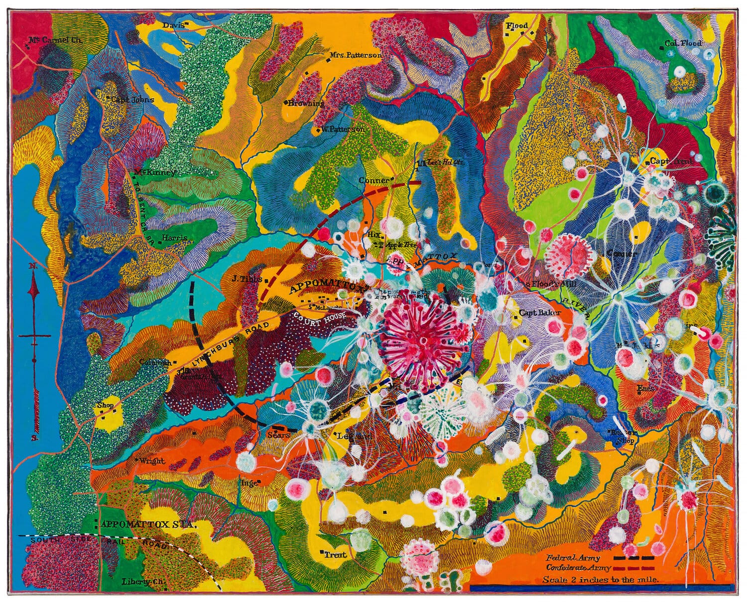 Luckily, Kozloff’s career wasn’t up to Clement Greenberg. Kozloff went on to have dozens of shows, beautify over a dozen buildings and transit systems with public artworks over the decades, and inspire new generations of artists to unabashedly lean into ornament. Once an active member of the peace protests of the 1960s, she has also continued her political activism, which in the 21st century has become more explicit in her work. Her all-over pattern paintings have morphed into detailed maps, from Civil War battle plans exploding with viruses to aeronautical charts dotted with points that the United States has bombed.