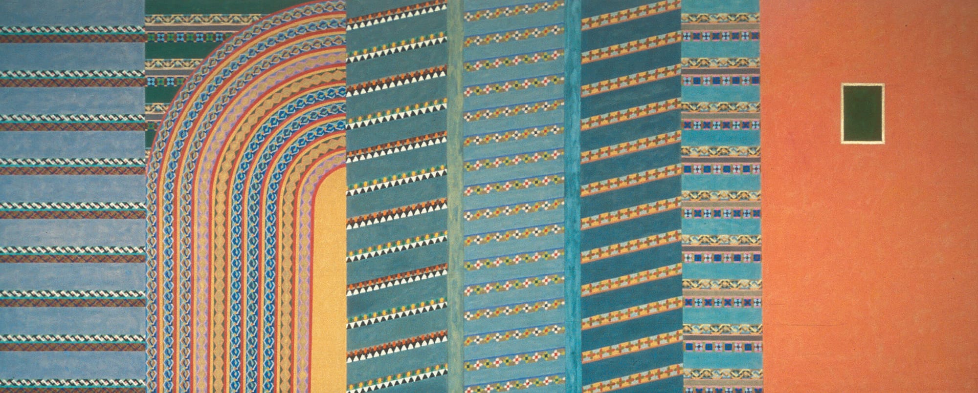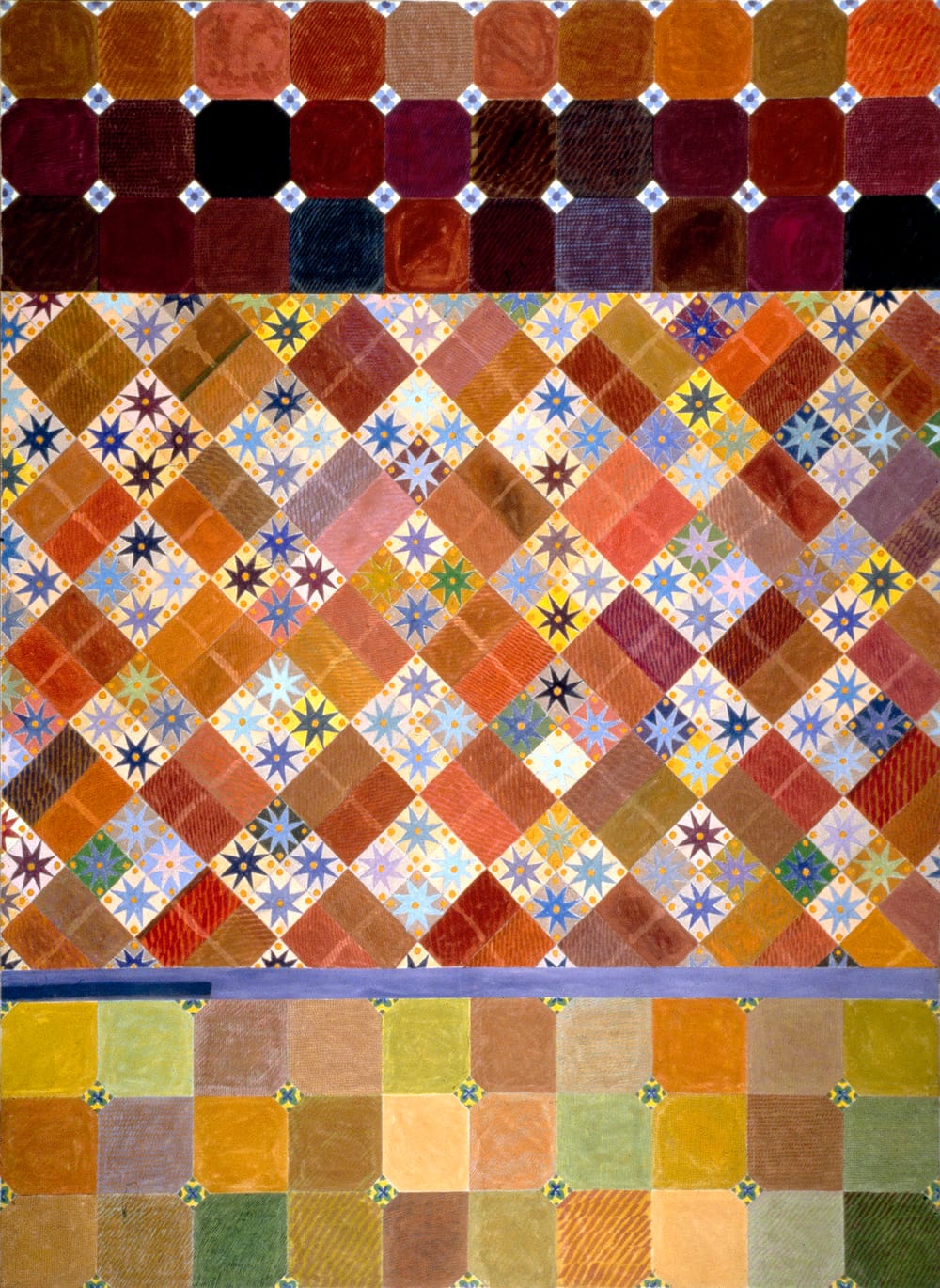 In 1973, gallerist Tibor de Nagy gave Joyce Kozloff a call. His voice quivered as he told her that Clement Greenberg had just left the back room after giving a searing review of her latest work. Greenberg had scoffed at the artist’s “Three Facades” (1973), a painting based on the rich tapestry of interlocking bricks and tiles on Churrigueresque church facades in Mexico, and said that it “looked like ladies’ embroidery” — as if that was a bad thing. Kozloff told us that “Tibor freaked out” and asked her “to take it away.”