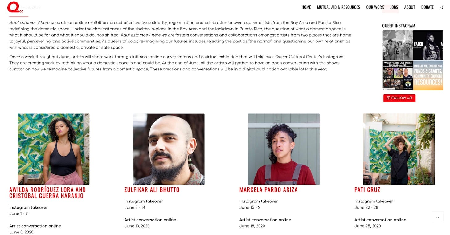I’ll be curating aquí estamos / here we are a project for the Queer Cultural Center in San Francisco. The project itself is an act of solidarity, regeneration, and celebration between artists from the Bay Area and Puerto Rico. In addition to sharing the artists’ newest work in social media, every week I’ll be having intimate conversations with each artist about the domestic space, solidarity, celebration, and regeneration. These conversations will be shared online weekly during June. On June 30, I’ll be hosting a live conversation, open to the public, as well as a celebration with four artists — two from the Bay Area and two from Puerto Rico — during which we will be talking about queer solidarity, regeneration, celebration, and the Stonewall anniversary.