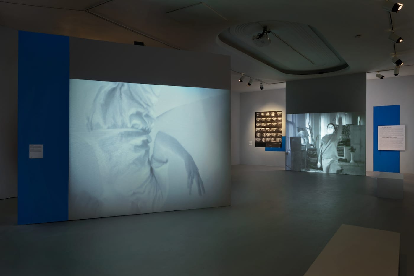 Radiant Nature centers on Downey’s theories of movement, mind, and psychogeography. The exhibition is organized into three areas: video work, performance documentation, and archival material, focusing primarily on the artist’s early work, which carefully studies the aforementioned topics. On the walls are photographs of performances that took place in New York, while the center of the space is occupied with various video pieces Downey orchestrated. One particularly striking piece is an enlarged photographic documentation of a video-performance, Nazca, which took place at The Kitchen in New York in February 1974. With this performance, Downey highlighted the devastation of the natural environment caused by the construction of the Pan American Highway, a road that connects South and North America. The artist traced the outline of a bird in ancient geoglyphs and lay still in the center, as two performers, Carmen Benchat and Suzanne Harris, moved diagonally across the space, with white chalk filling their shoes and coating their faces. The residue of the white chalk on an otherwise intact geoglyph symbolizes human interference in natural sites.