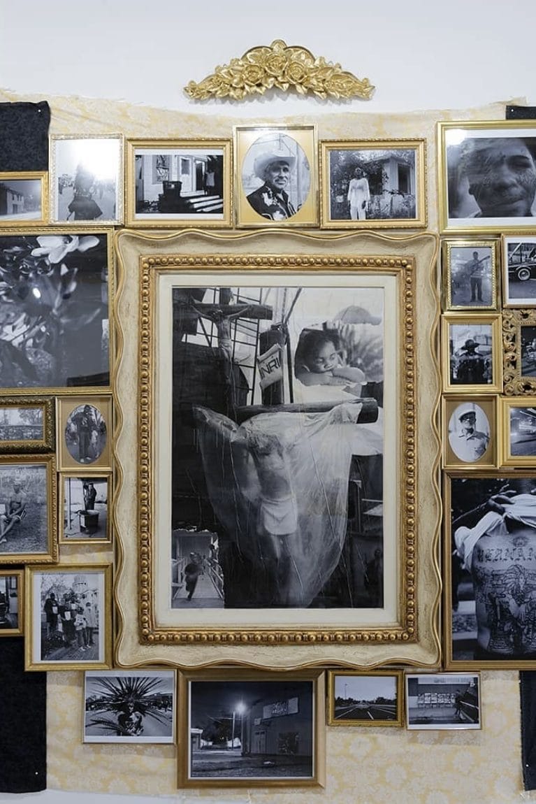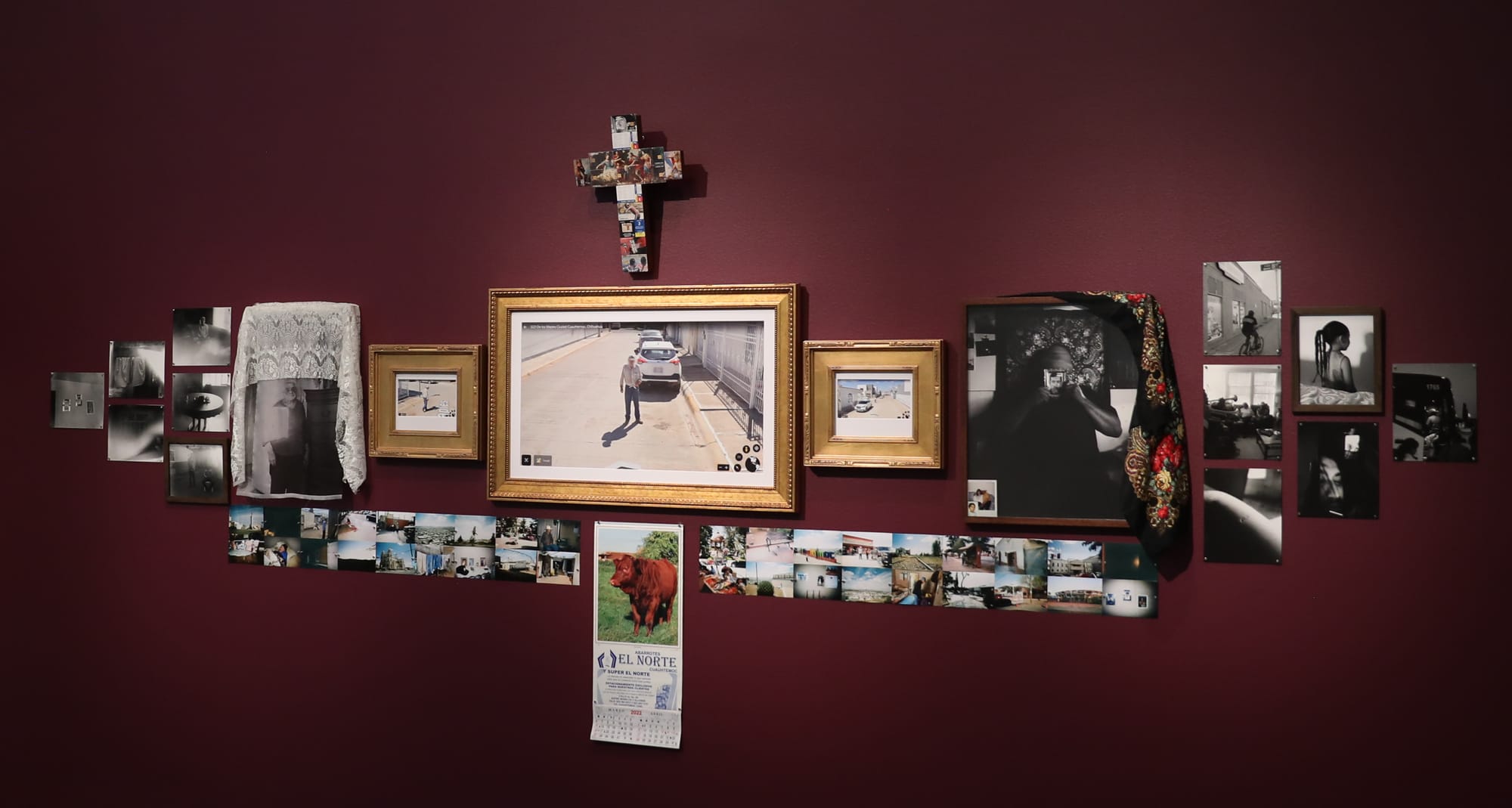 His installation “On the Dirt, Our Knees Tell Truths” (2022) in the Denver Art Museum’s group exhibition Who tells a tale adds a tail is the first time Fuentes turned his camera toward his family on both sides of the border. Photos tucked into frame corners, a swatch of lace, and a dime store calendar all recall a living room wall lovingly curated. Within the gilded central mounts are images of his grandmother’s address produced by Google Street View. To Fuentes’s own surprise, his uncle can be seen walking among the sun-bleached buildings and fences. Photographer Colby Deal traveled to Mexico to capture the Fuentes family and home for the piece, but his lens suffered a light leak, resulting in blurred streaks that make the figures and spaces hard to possess. The band of images along the bottom of the installation were taken on disposable cameras by Fuentes’s older brother who was deported in 2018. At the pinnacle of the piece is a crucifix constructed from prepaid calling cards. Part altar and part archive, “On the Dirt, Our Knees Tell Truths” complicates the very concept of arrival stories and interrogates the term Dreamer because it tells a Latin American story tangled with an American one.