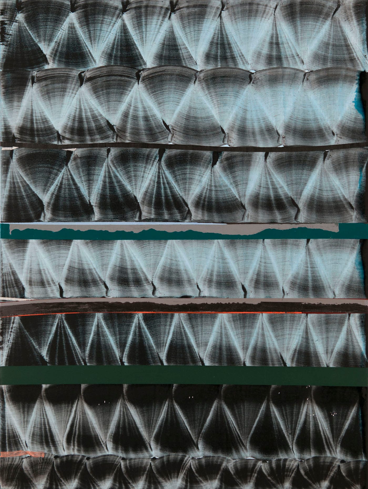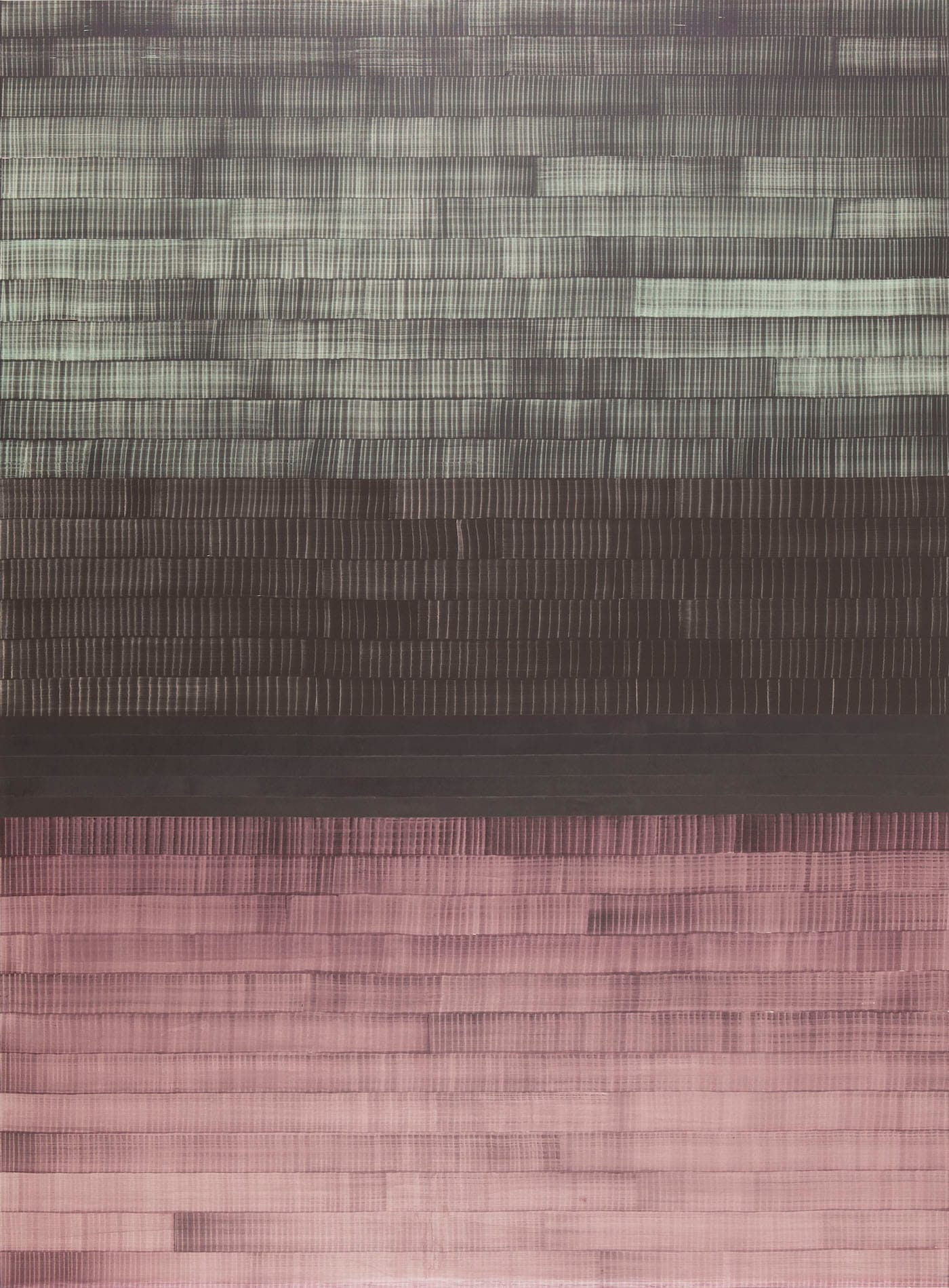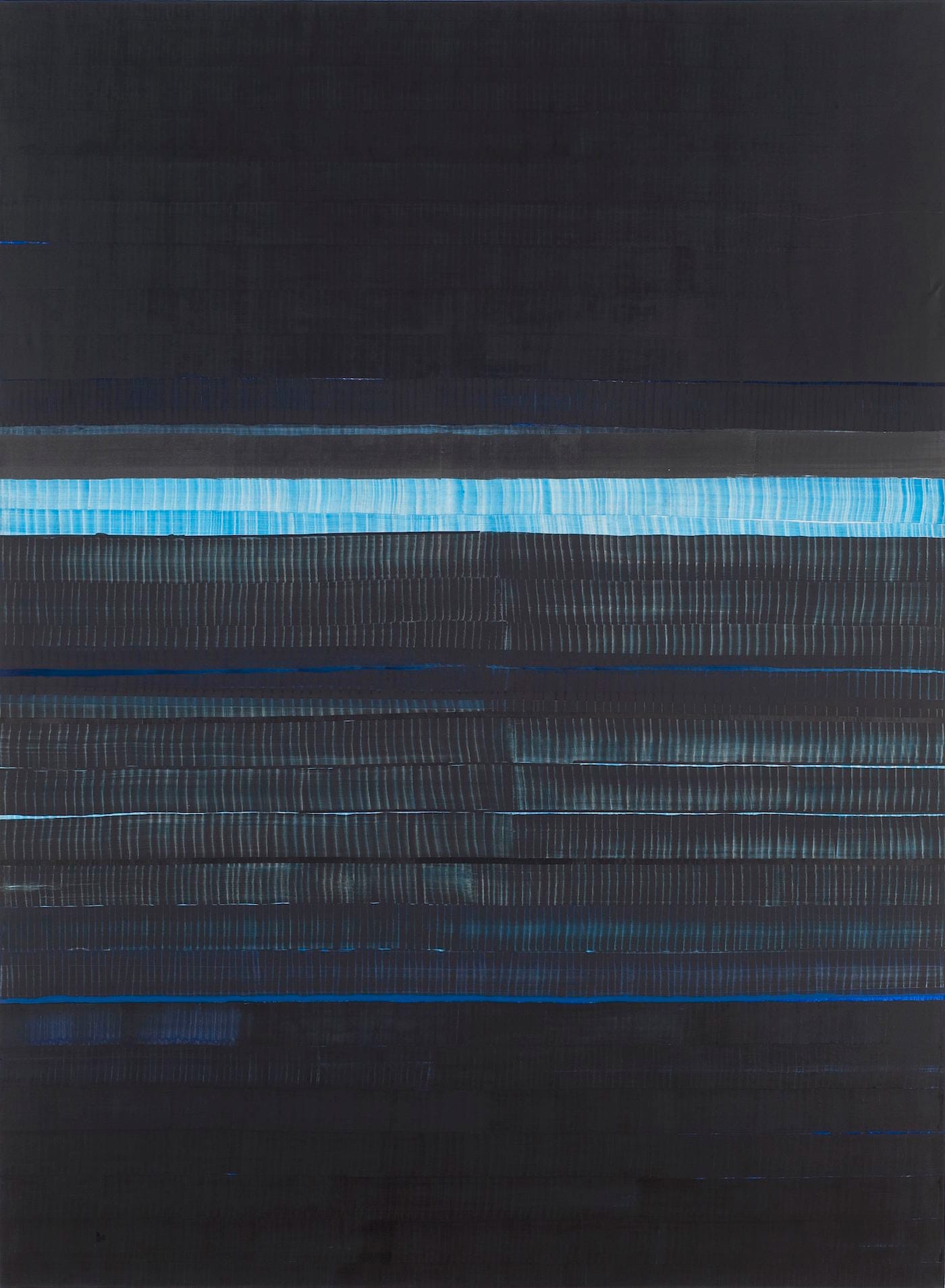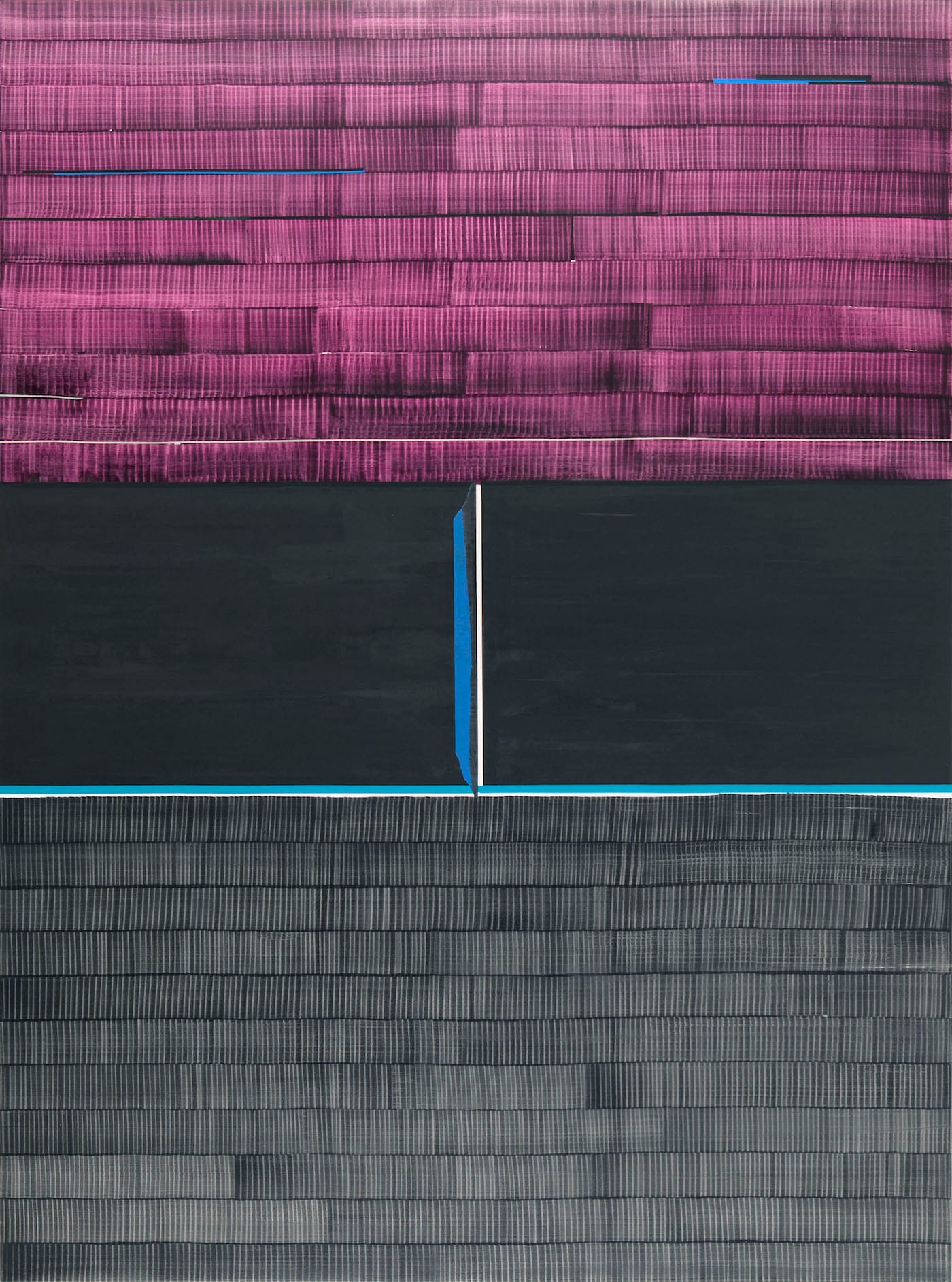 In “Soñé que revelabas (Columbia)” (2015), a red linear element runs from left to right between two lower rows; it does not span the painting’s width. In “Soñé que revelabas (Ganges)” (2016), Uslé divides the painting into three horizontal sections. The upper part is made of magenta brushstrokes, with two narrow blue linear elements lodged between the rows of brushstrokes, like evening light slipping through the crevice. While the lower section is the made of dark gray brushstrokes, the middle section is solid black, divided midway by a severe, vertical white band, which also runs along the bottom of the section, spanning the painting like the lip of a windowsill.