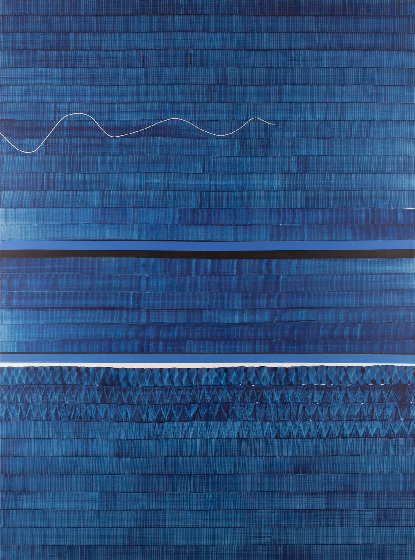 To the left of the vertical white line, Uslé has painted a blue band whose top and bottom edges are angled in. A different colored blue line is abutted against the top edge of the thin, horizontal white line running along the bottom of the solid black section. Together, the white and blue lines dividing the black section hint at dimensionality, making the solid black into an impenetrable space. Is this blackness – at once immediate and unknowable – what the “you” (or the painting) revealed to Uslé in a dream? In the largely blue “Soñé que revelabas (Danubio)” (2016), a white line undulates in from the upper left side of the painting, like a snake or thread. It gives the painting an unexpected jolt, and causes us as well to closely scrutinize the painting.