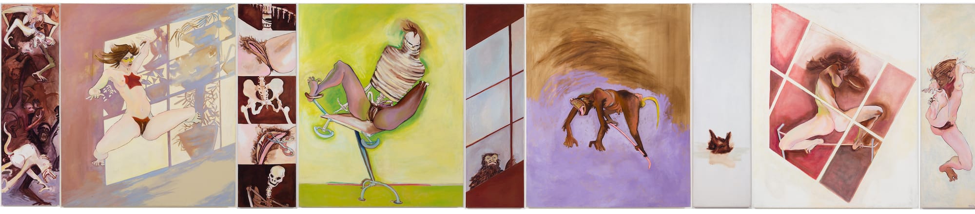 In McNeely’s other works, bodies contort and move as if constrained by an invisible force. As Hyperallergic noted in a 2020 review, the artist's work evokes the same experiences people face today while seeking medical treatment in the archaic and chronically under-researched women’s health field that consistently underserves them. After the overturn of Roe v. Wade last spring, the artist’s paintings took on a new life, assuming the same life-or-death urgency they held when she created them before 1973.