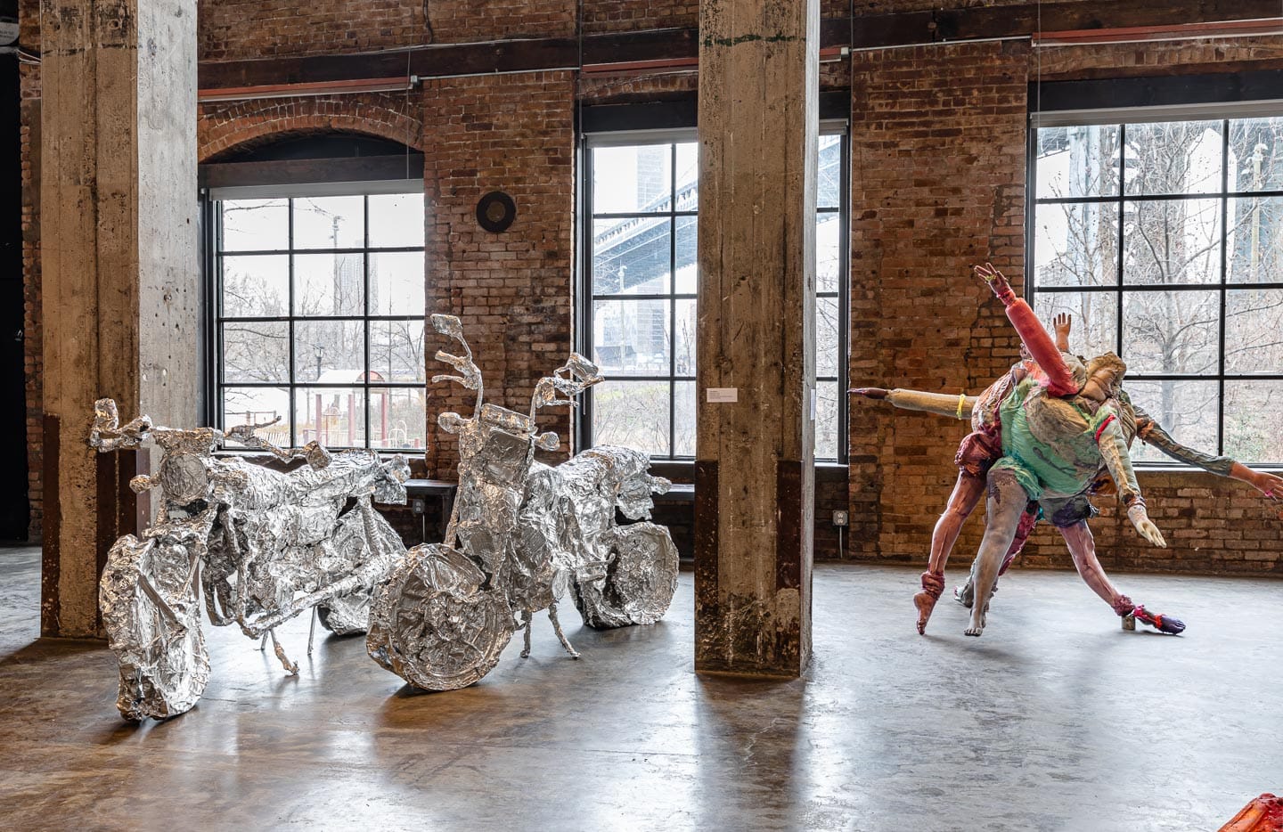 Across the gallery, “Ghost Bikes” (2014), two motorcycles made of aluminum foil, are robbed of the growling, low-throated power of actual motorcycles. Just as the ghosts of the original bikes seem to manifest, they shrink into aluminum-wrapped leftovers of a meal — or perhaps a reality that is hard to stomach.