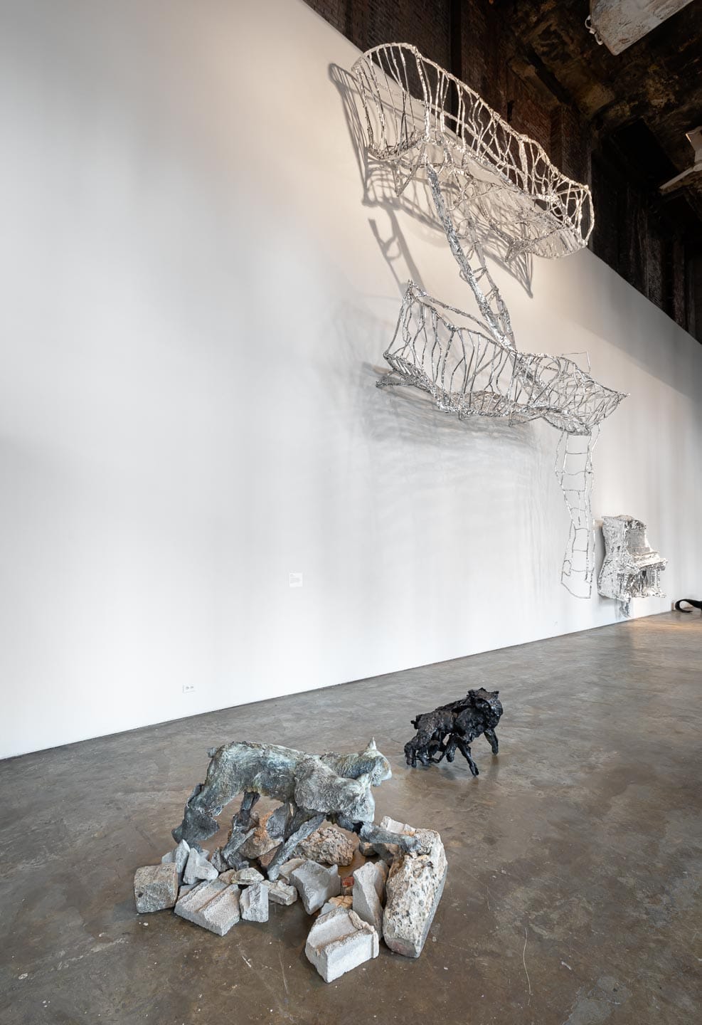 “Fire Escape” (2020), on the wall nearby, is a full-scale three-story New York city fire escape, constructed from industrial-weight aluminum foil over a steel armature. Its flimsy, battered appearance and precipitous angle threaten to drop anyone who dares step foot on it straight onto the street. To its right is another aluminum piece, “Piano Forte” (2016). The dented and crinkled form of an upright piano hangs from the wall, a pair of cast aluminum feet dangling behind the piano pedals, transmuting the piano into a ghostly spirit ascending into the firmament. By recreating heavy and substantial objects with aluminum and other lightweight materials, Tallichet undercuts their heft with a sense of impermanence and instability.