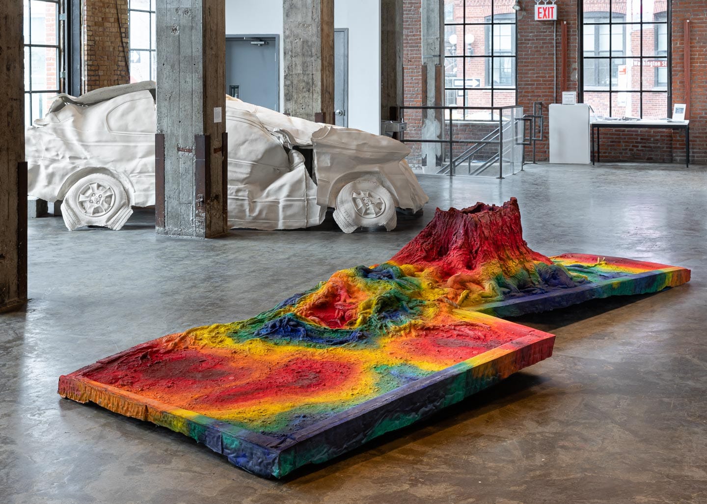 Jude Tallichet’s world is profoundly disorienting. She transmogrifies the world around us. Despite the implications of disaster, just under the surface bubble currents of humanity, humor, and joy. These are reminders that, although our world has changed, something weird and wonderful may await us on the other side. In this sense her work is redemptive: the aluminum fire escape and human-piano hybrid rise up to become constellations on the stark white wall. Meanwhile, the car has transubstantiated into something ethereal, the pods metamorphose, and “Heat Map” rises like a phoenix from the sidewalk — as a new embodiment of the sum of its multiple meanings, a multicolored incarnation of a future unknown.