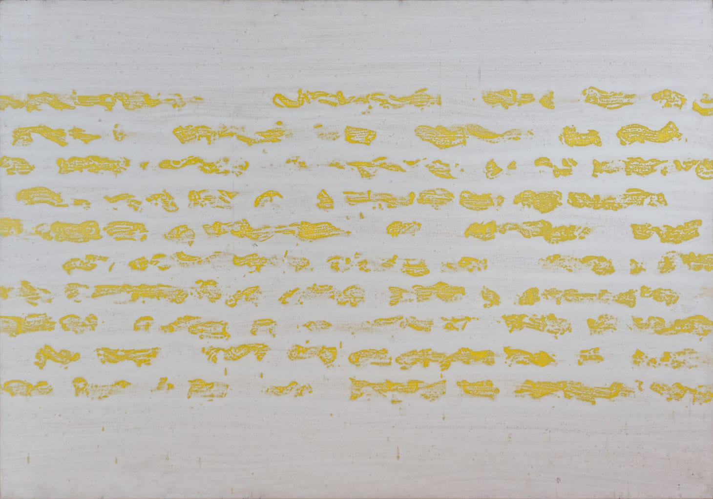 The process that Reigl developed for making these paintings began with hanging large, loose sheets of fabric from the ceiling around the perimeter of her studio. Circling around the sheets, brush in hand, to the sound of classical music on the radio (mostly Johann Sebastian Bach), she would repeatedly mark the fabric surface with a touch of enamel paint, which slowly seeped into the surface. She would then saturate the background in acrylic washes by working on one or both sides of the fabric. She next picked the side she preferred, cropped it, and stretched it.