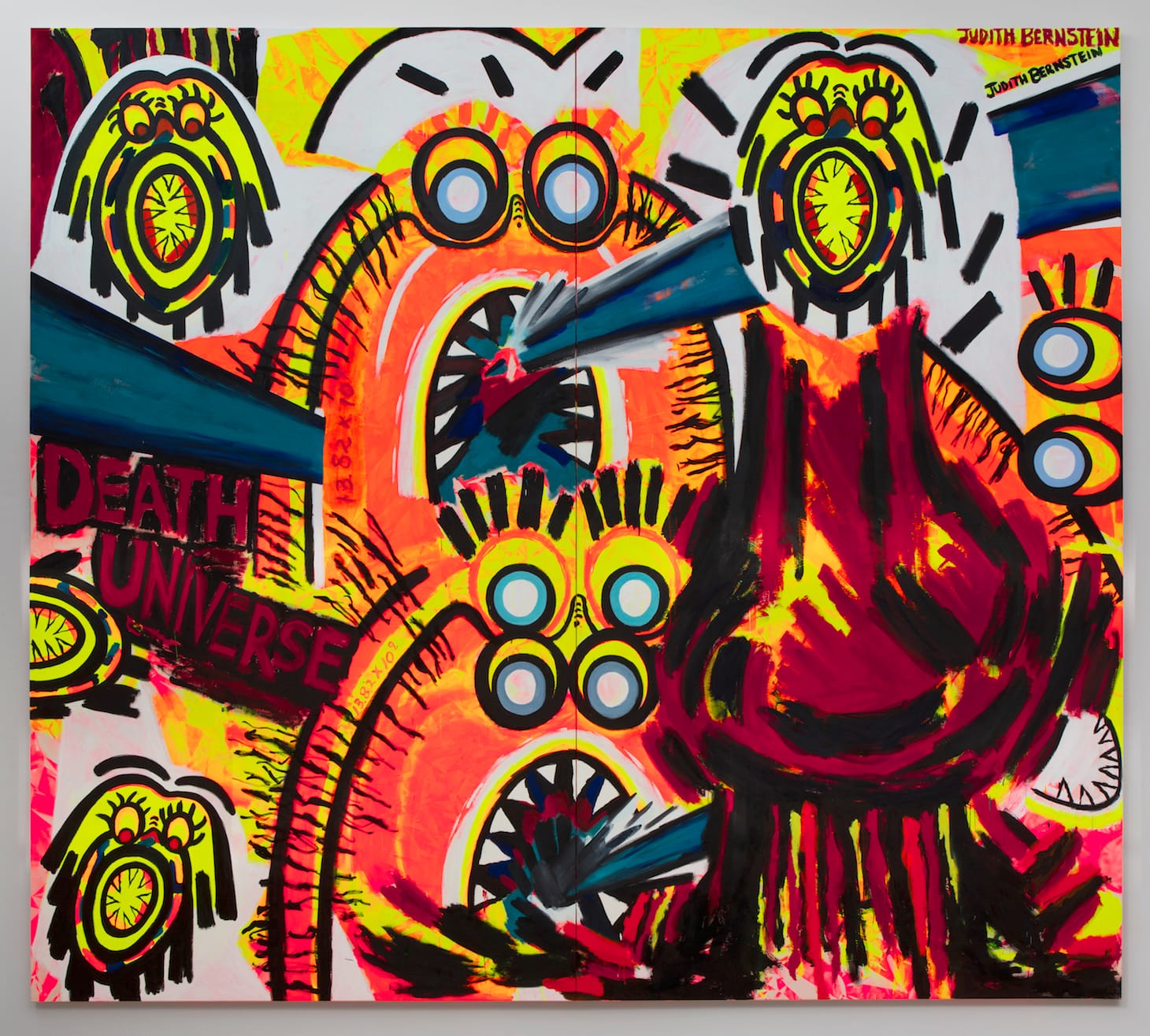 In interviews Bernstein loves to relate how, as a graduate student in studio art at Yale University in the 1960s, the graffiti in the men’s restrooms inspired her to make her aggressive paintings of cocks and cunts, the bravely pioneering feminist works that made her famous. Fair enough — these sources do matter. And visual shock has always been important to her. But what also must be said is how skilled and precise an artist she is. I grant that “Death of the Universe #1” (2018), which is 12 1/2 by 14 feet, catches your eyes even from outside the gallery, when you are still standing on 28th Street. But once you stop to look, you will see that the high-pitched orange-reds, the thrusting, black-edged lines of blue, and the artificial, glowing greens are perfectly poised. As a colorist, Bernstein deserves comparison with André Derain in his Fauve landscapes or Frank Stella in his acrylic Protractor series (1967–71). Seen under black light, this image of the death of the universe is spectacular. What a cheerful way for everything to go!