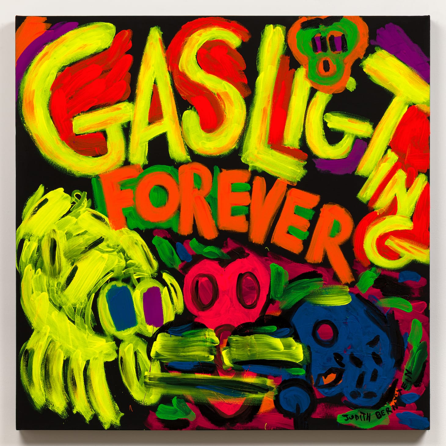 Gasligting Forever. Is there a typo in this transcription of the title for Judith Bernstein’s show — should it read, rather, “Gaslighting?” No! Bernstein means “gasligting.” For, as the gallery announcement explains, by intentionally misspelling the word, removing the ‘h’ in the title, the artist wants viewers to “momentarily question their own sanity.” I know of no better account of the net expressive effect, a curious combination of feigned terror and real visual pleasure, which is consistently provided by her art. You’d have to be seriously crazy not to momentarily question your sanity when viewing this show.
