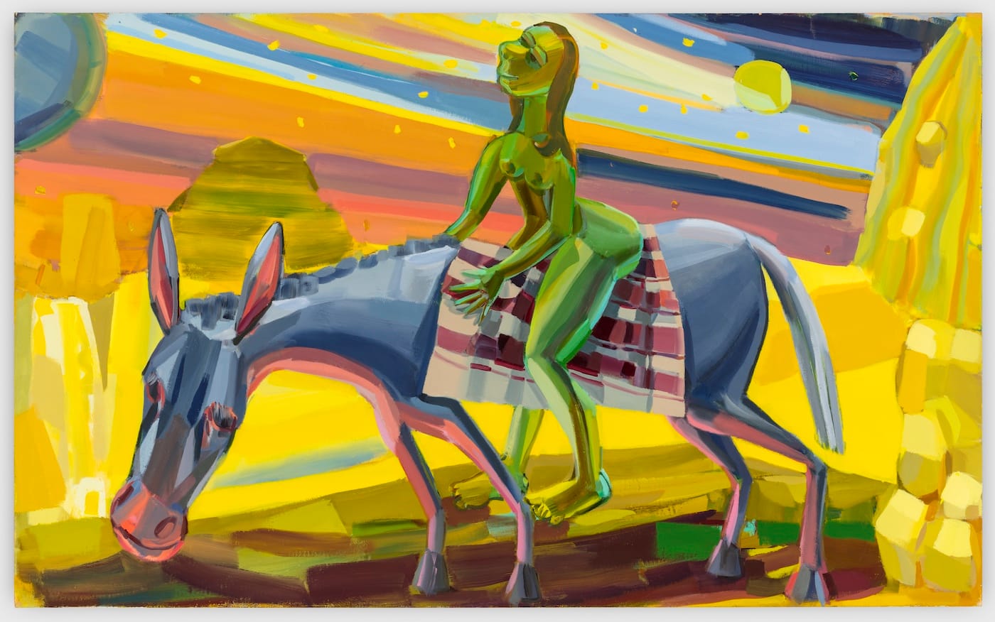 In many of the paintings, Linhares seems to have first laid down a ground of stripes. These can be narrow, multicolored, and jarring, or relatively wide and tonal — evoking wallpaper, curtains, an overcast sky, or the sun’s bright rays. Going back into the painting, she often makes additional abstract bands, which, with a change of color, can become a woman’s legs, or, if she uses a similar color, the stripes of a tiger. This is a fairy tale world, and the colors are unreal — the woman astride the tired horse in “Dawn” (2017) is painted in a variety of green hues. Her skin color is echoed by the rocky landscape and the streaked sky, where a green celestial body hovers just above the horizon.