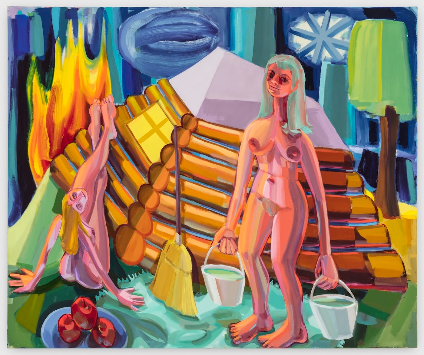One of the great things about Linhares’s work is that everything in the painting seems straightforward until you look closely and start asking questions. A naked woman carries two buckets. Why is there a plate with three apples on the ground, a few feet away from her? What is a hexagonal log cabin doing behind her? And why are flames rising from behind it? Unlike the cartoonists who influenced her, Linhares doesn’t feel the need to spell it all out, make clear what everything is. Her works follow an internal logic and sense of randomness that far outpaces anything found in cartoons, which tend to adhere to Isaac Newton’s worldview of cause-and-effect.