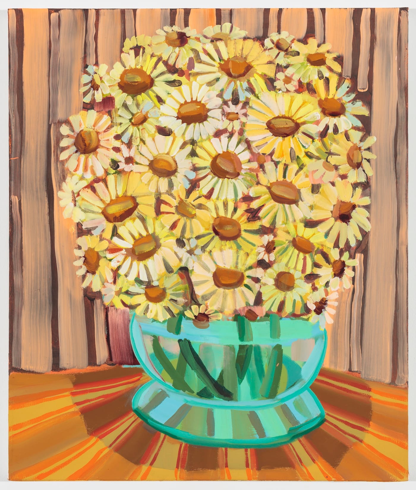 In the five still-lifes of flowers, all of which are bouquets in what look like inexpensive turquoise green glass or plastic bowls and vases, we see a prominent display of circles and stripes, with a striped background forming a niche for the surface the receptacle sits on.