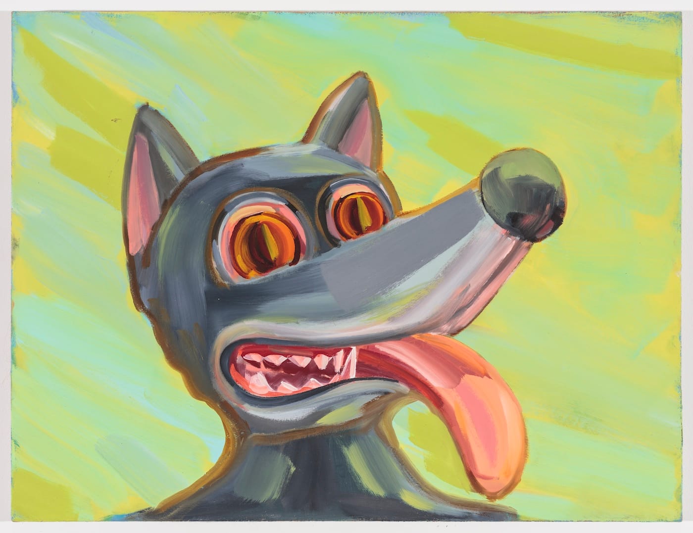 In “Thirst” (2018), Linhares depicts a long-snouted dog with big saucer eyes and its tongue hanging out. In “Frog” (2014), the title amphibian’s yellow eyes are staring up at the sky, while it sits on its haunches in some position of attention that seems very un-frog-like.